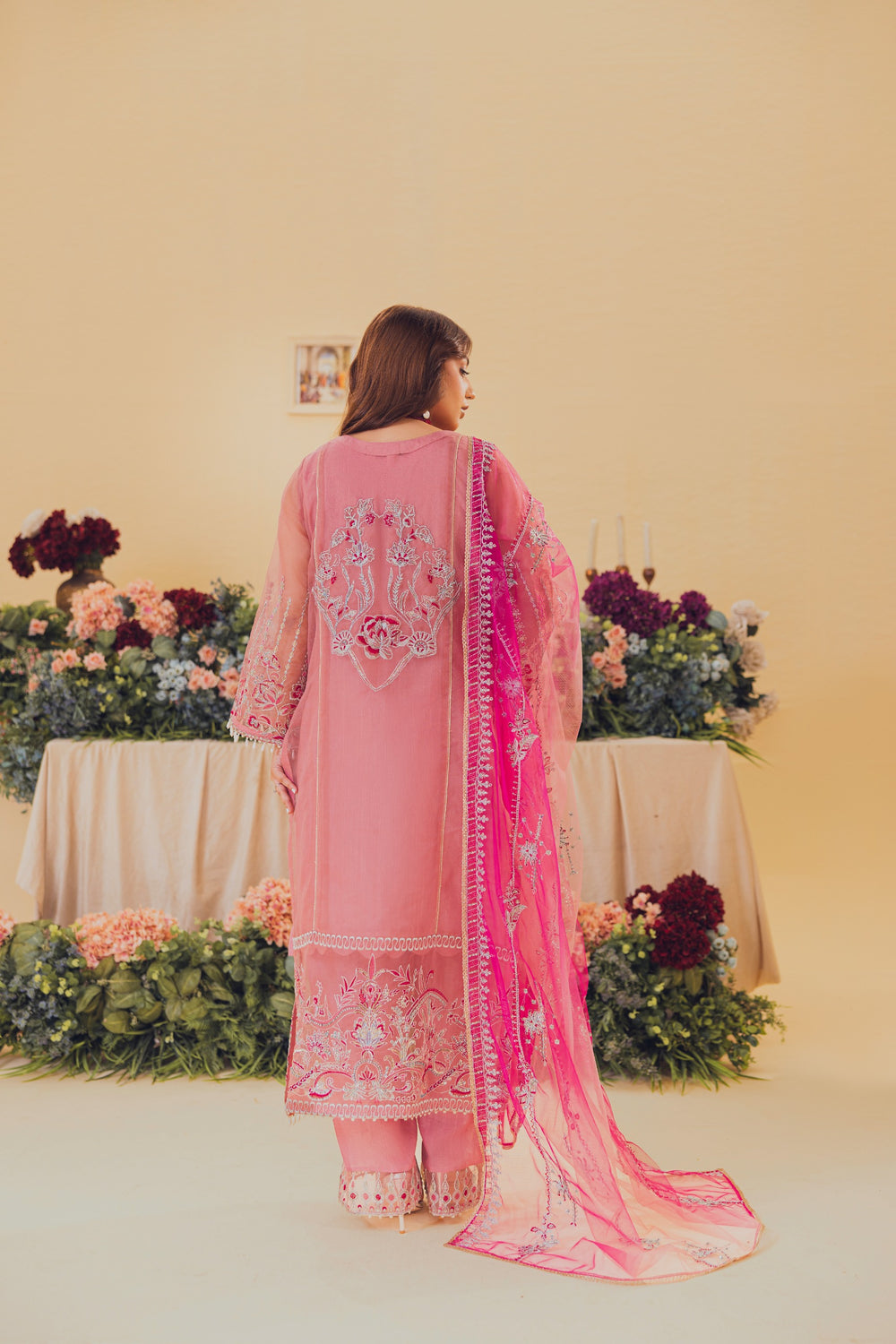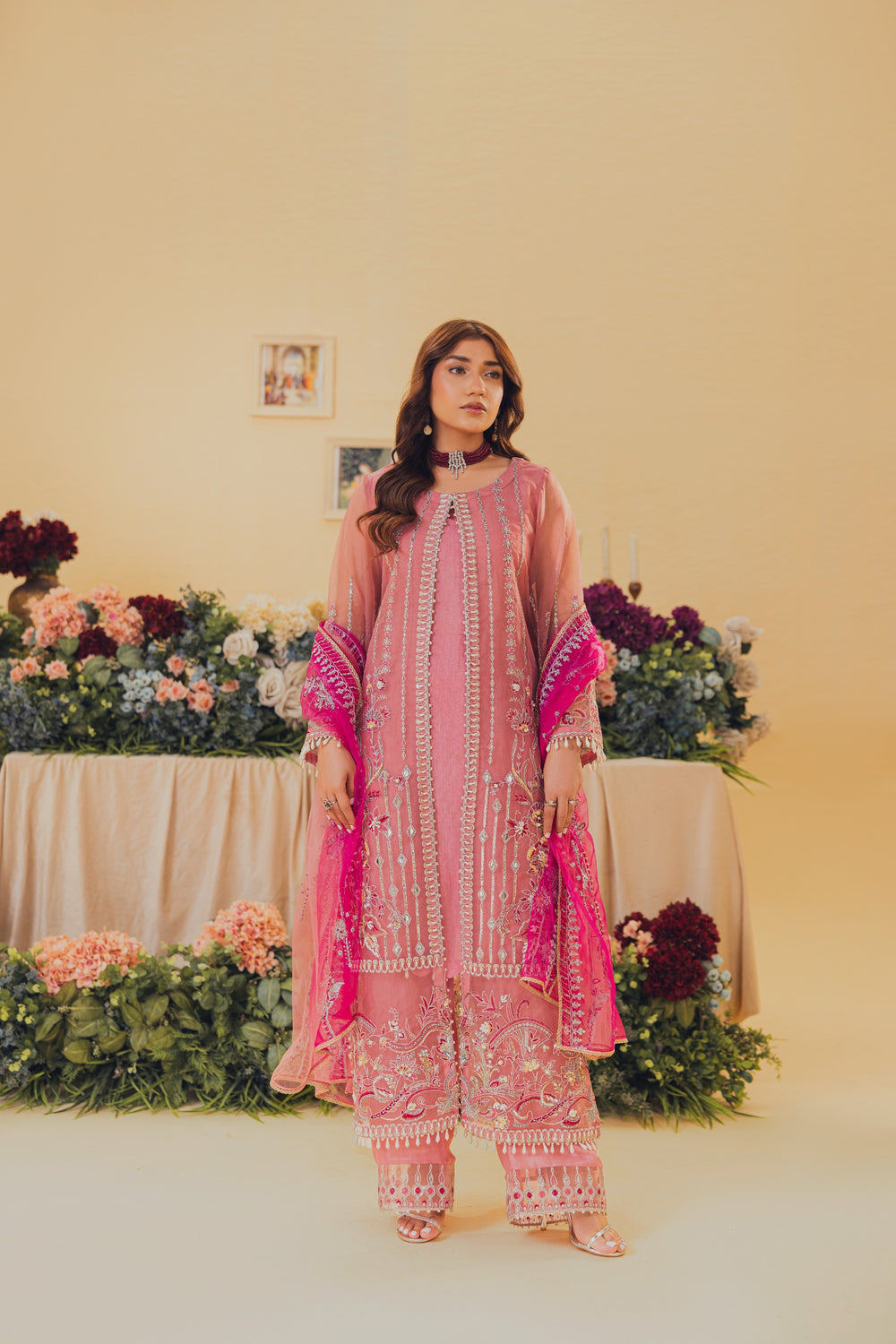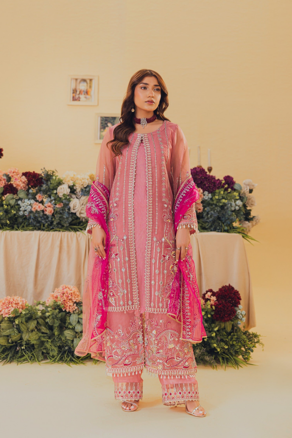 Introducing Tea pink, a mesmerizing open gown adorned with exquisite details. Its heavy front, embellished with crystals, naqshi, dabka, and sitaree, exudes opulence. The gown is finished with delicate lace, while heavy adda work and line motifs add a touch of elegance. Sleeves boast an intricate border finishing with lace, and the back features a stunning center motif. Complete with embroidered borders, sequin line work, and spray motif embroidery duppata with lace edge.