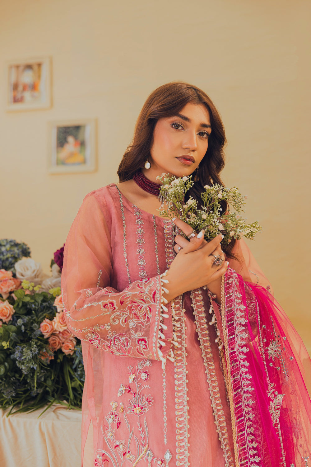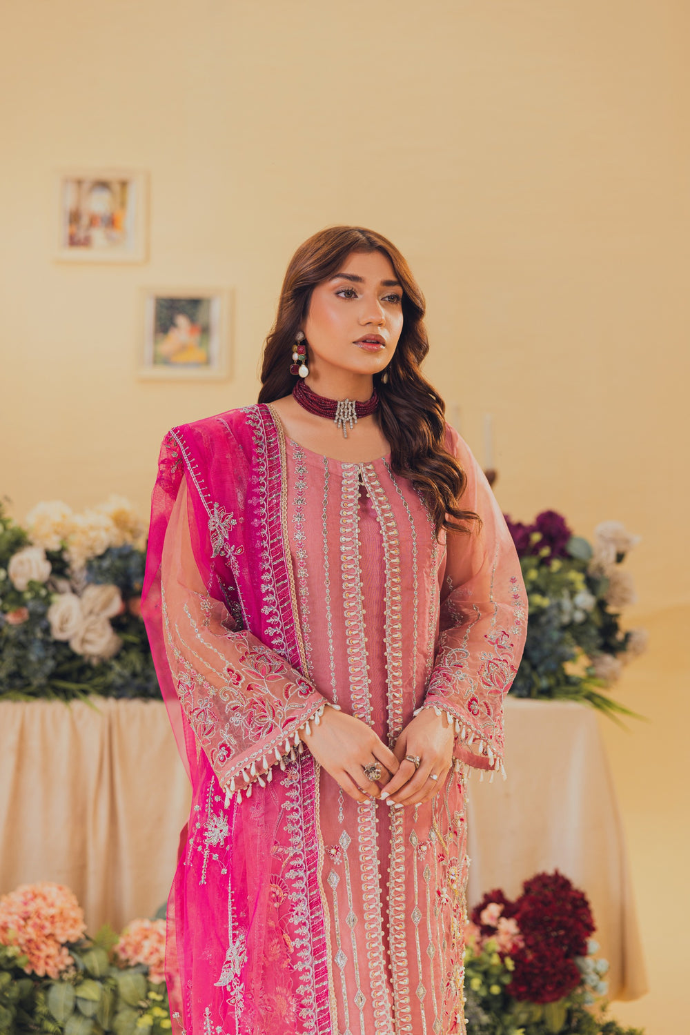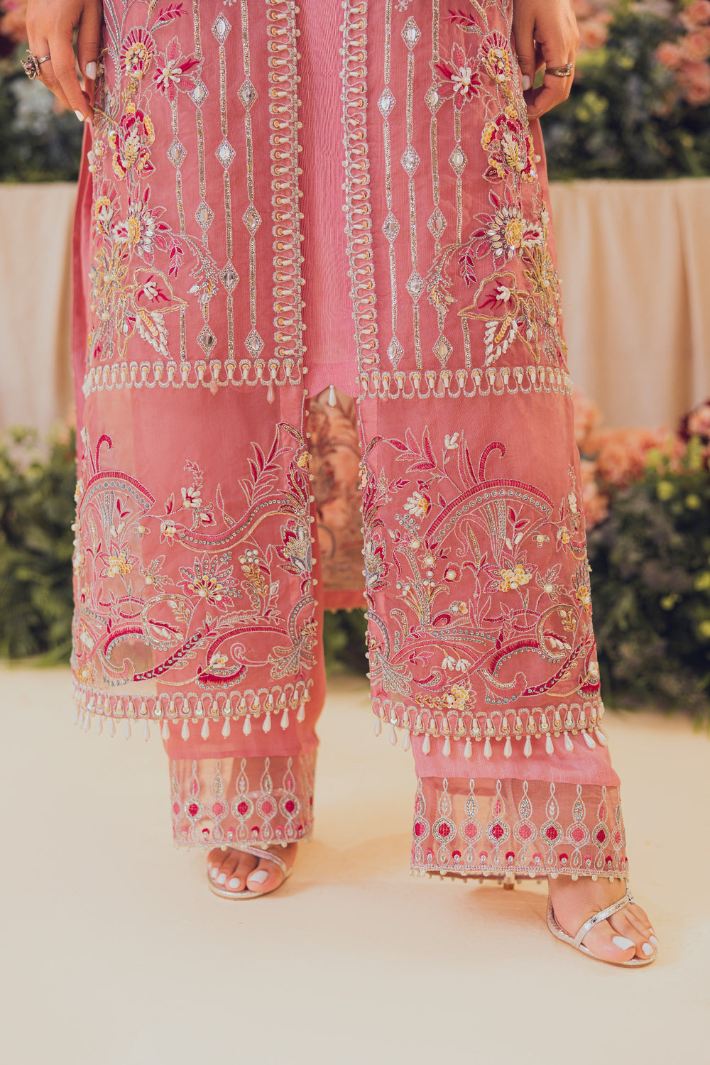 Introducing Tea pink, a mesmerizing open gown adorned with exquisite details. Its heavy front, embellished with crystals, naqshi, dabka, and sitaree, exudes opulence. The gown is finished with delicate lace, while heavy adda work and line motifs add a touch of elegance. Sleeves boast an intricate border finishing with lace, and the back features a stunning center motif. Complete with embroidered borders, sequin line work, and spray motif embroidery duppata with lace edge.
