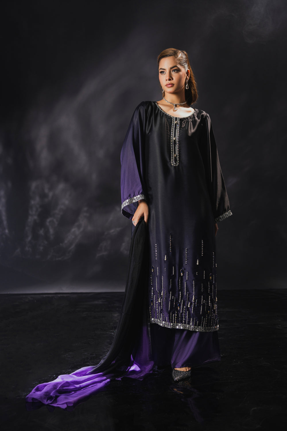 Elevate the all over spray line with a dimensional crystallized spray on black n purple omre china silk. The embellished lines on hem variation creates the beautiful illusion that keeps the audience in an awe. The line shirt n culotte gives room to make freely while the slits on the side seams. Wear this black dress paired with silk tye n dye dupatta around your neck.