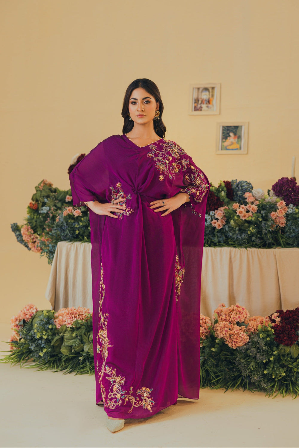 Illuminate your wardrobe with this striking botanical floral embroidery and heavy embellishment kaftan ensemble. The kaftan boasts a bold twist fold at the center, adding a touch of breezy interest to its elegant design. High side slit makes it a sophisticated silhouette, while exquisite exotic flower embroidery and adda work patch work brings a hint of artistic flair.