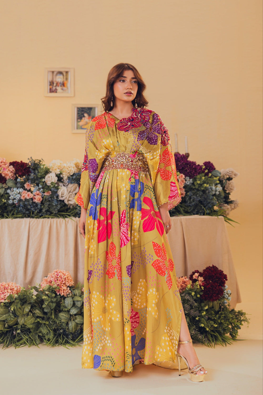 Illuminate your wardrobe with this striking floral print kaftan ensemble. The kaftan boasts a bold inverted box pleats at the center, adding a touch of breezy interest to its elegant design. High side slit makes it sophisticated silhouette, while exquisite exotic flower embroidery and adda work patch work brings a hint of artistic flair.