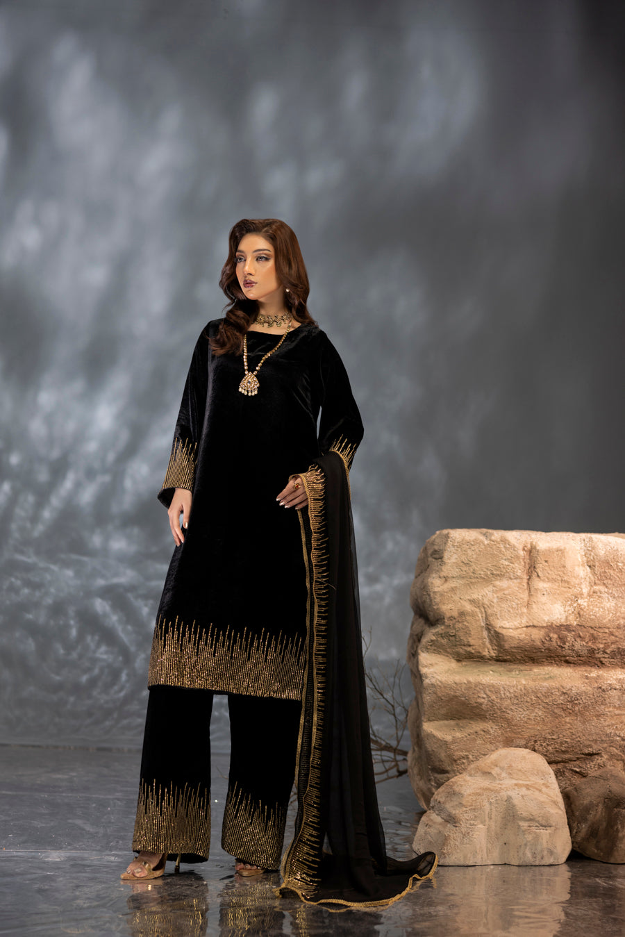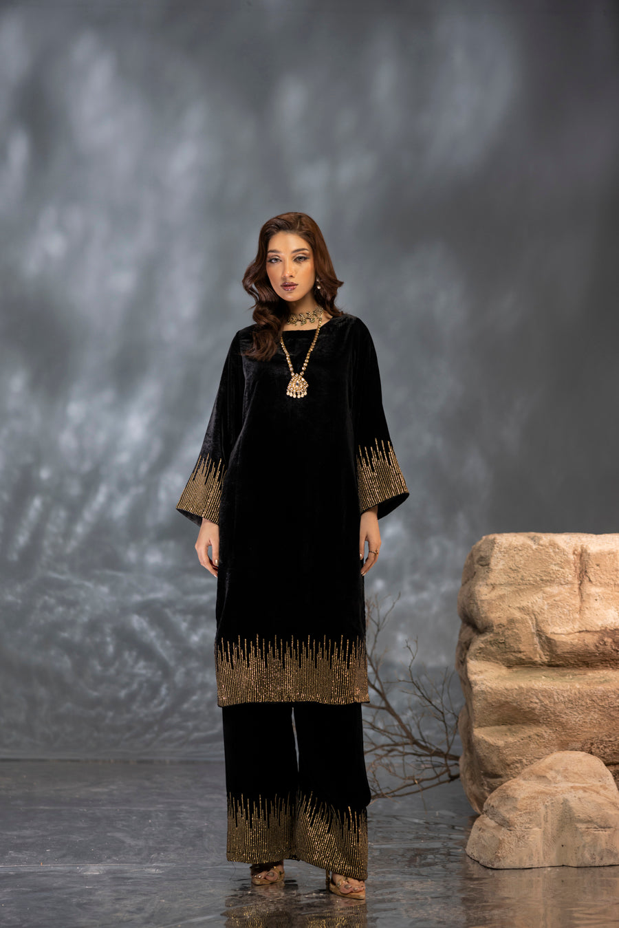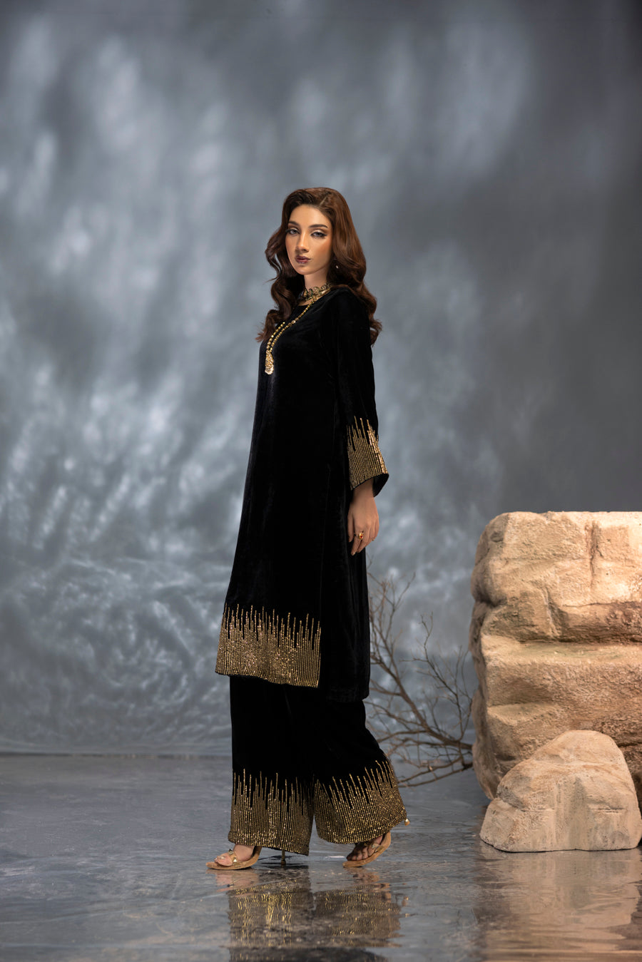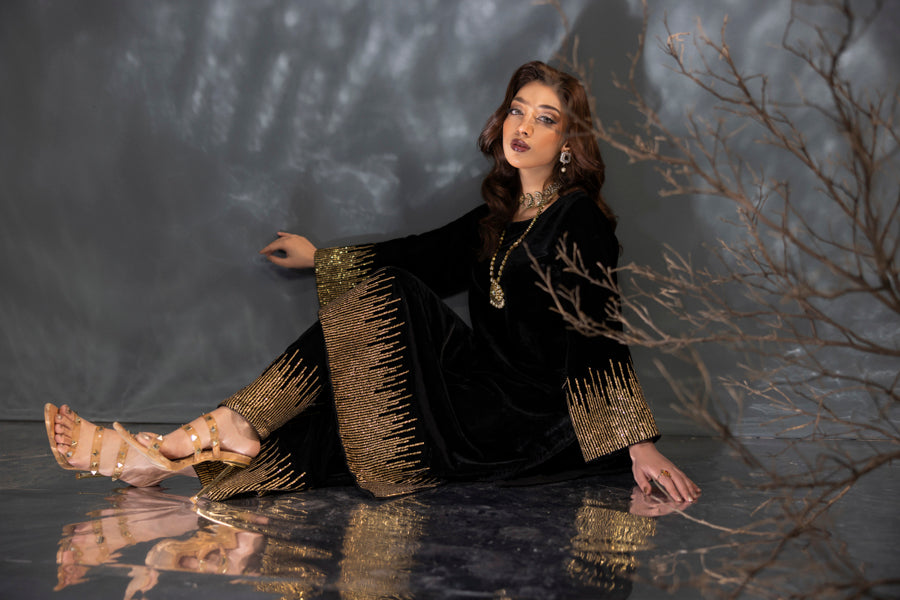 Step into the spotlight with this sophisticated black velvet ensemble, designed to capture the essence of midnight glamour. The plush fabric serves as a dramatic backdrop for shimmering sequin artistry that creates a radiant, light-catching effect. Featuring meticulous hand-embellishments that flow along the sleeves and hem, this outfit offers a seamless blend of high-fashion structure and festive sparkle. Perfect for evening soirées, this look ensures a presence that is both bold and timeless.