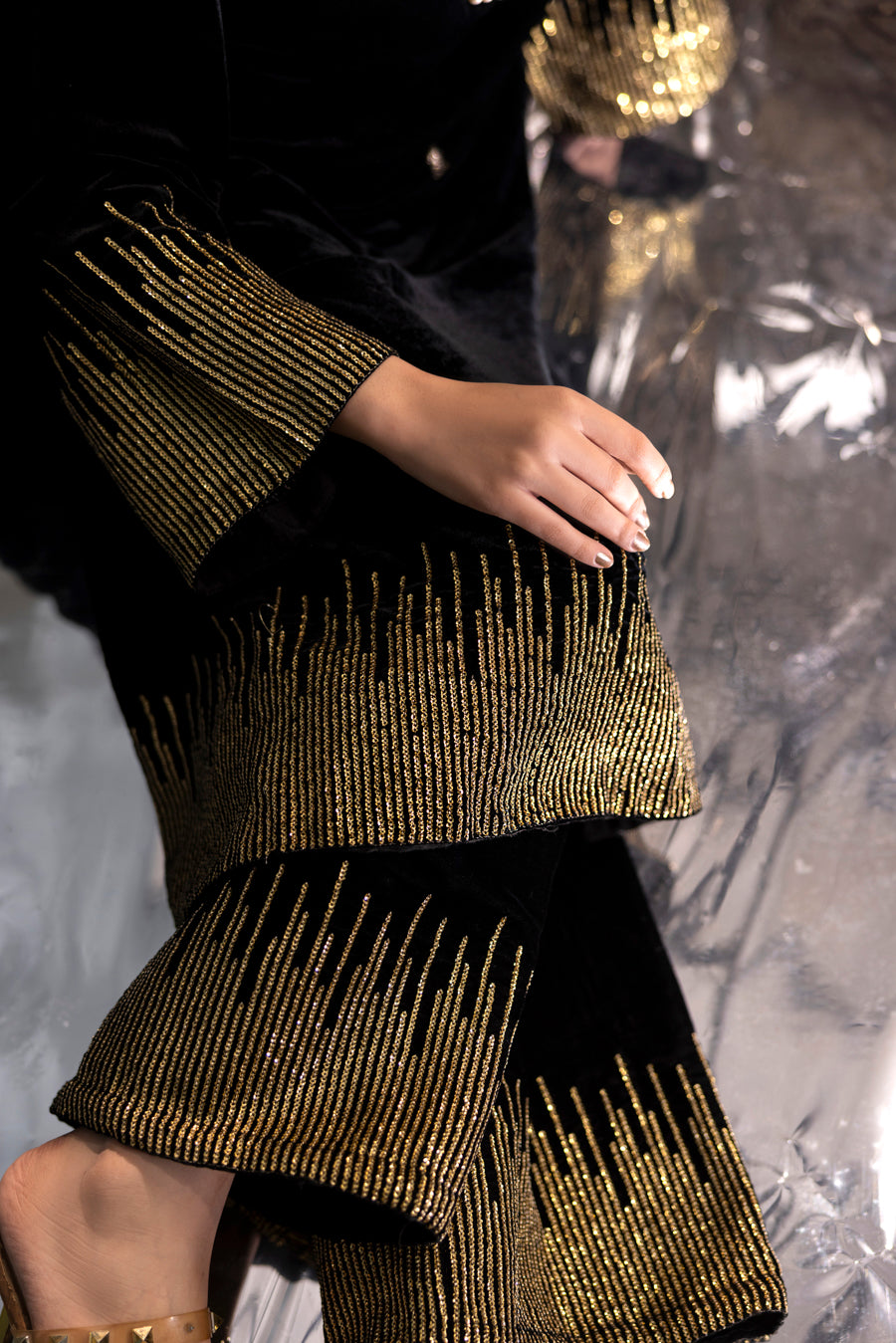Embellishment: Linear embroidery with intricate sequin detailing