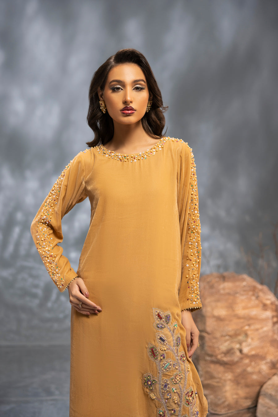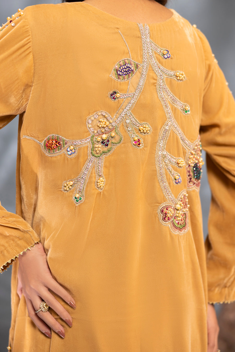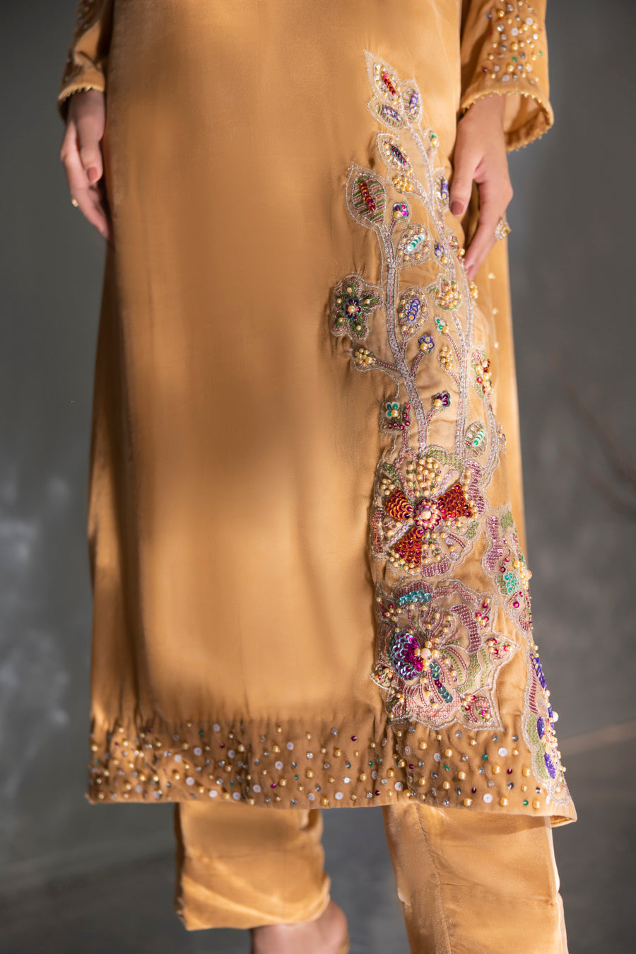 Radiate warmth and luxury in this breathtaking golden velvet ensemble. The luminous, honey-toned fabric is expertly tailored to a graceful long silhouette, providing a rich canvas for vibrant artistry. This piece features a striking multi-color embellishment that transitions from the neckline down to a stunning floral motif on the hem. Intricately hand-worked with a kaleidoscope of shimmering materials, this outfit strikes the perfect balance between traditional opulence and contemporary flair—making it a standout choice for grand winter celebrations.