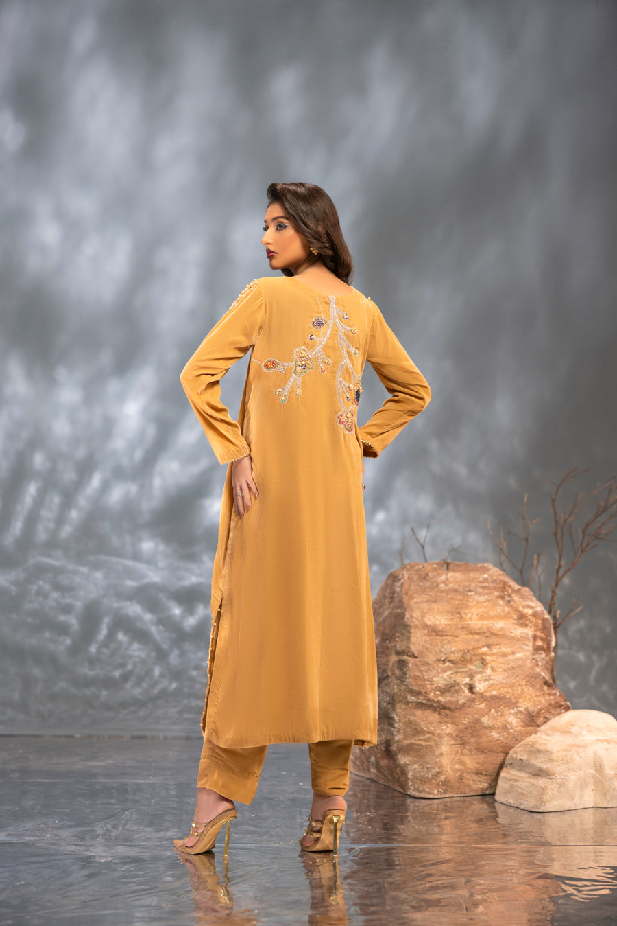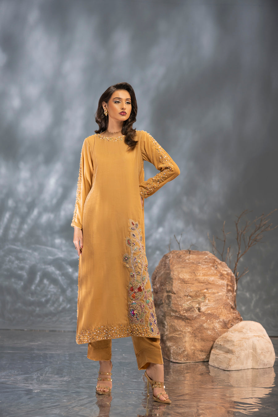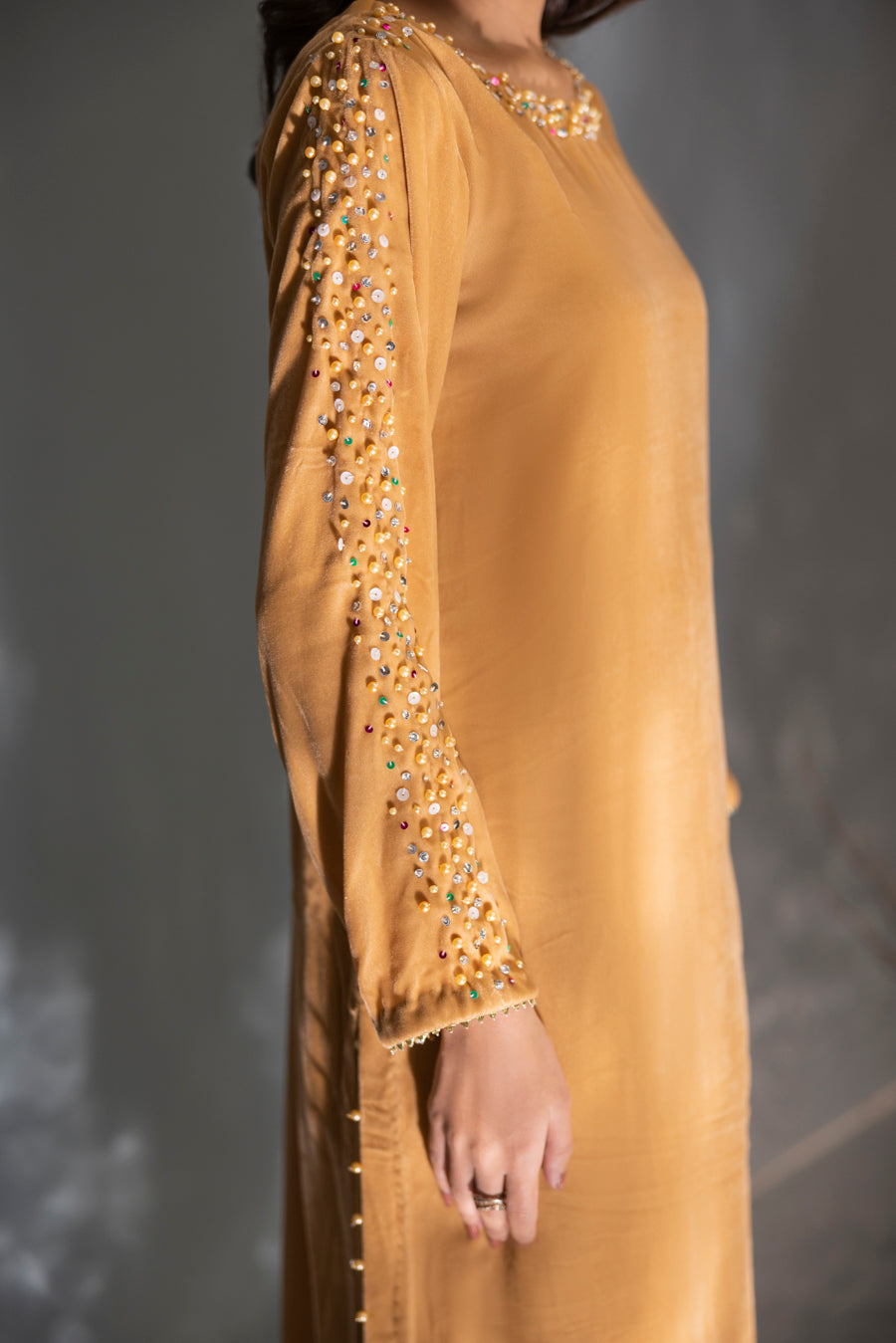 Radiate warmth and luxury in this breathtaking golden velvet ensemble. The luminous, honey-toned fabric is expertly tailored to a graceful long silhouette, providing a rich canvas for vibrant artistry. This piece features a striking multi-color embellishment that transitions from the neckline down to a stunning floral motif on the hem. Intricately hand-worked with a kaleidoscope of shimmering materials, this outfit strikes the perfect balance between traditional opulence and contemporary flair—making it a standout choice for grand winter celebrations.