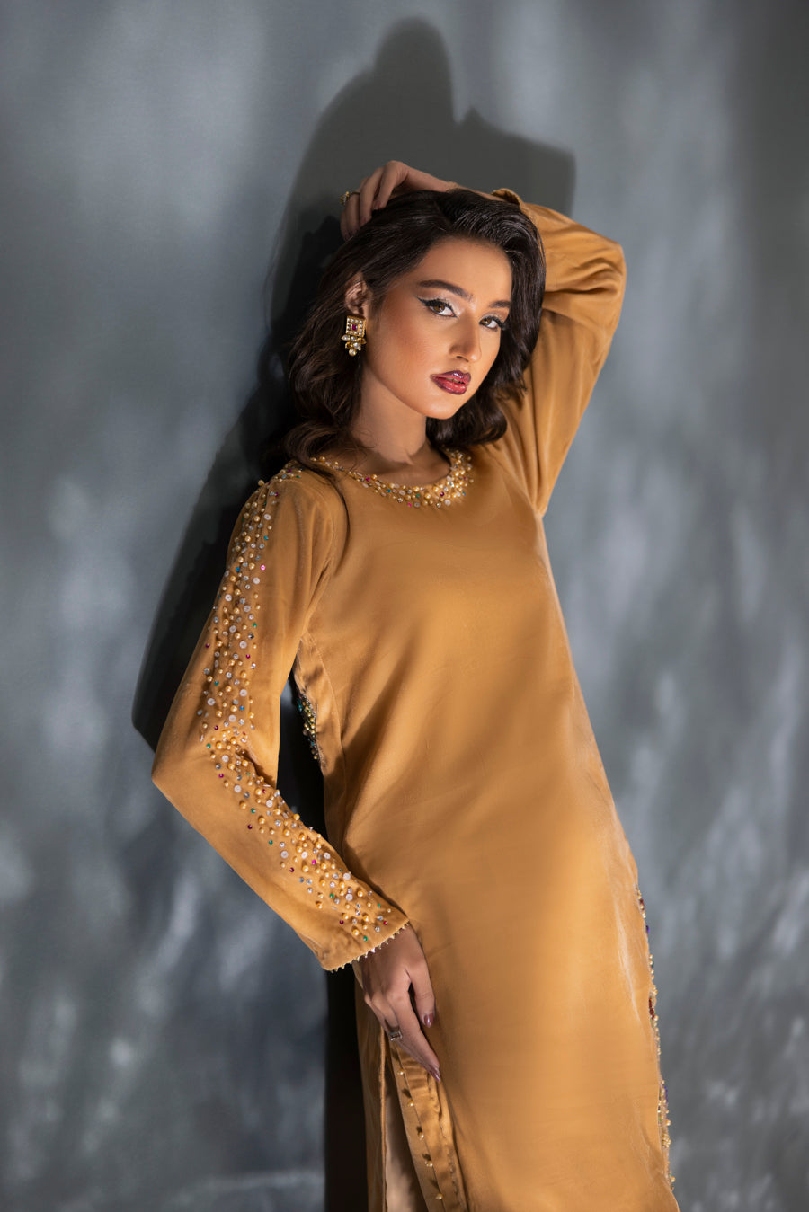 Style: Long straight-cut shirt with full embellished sleeves and matching trouser