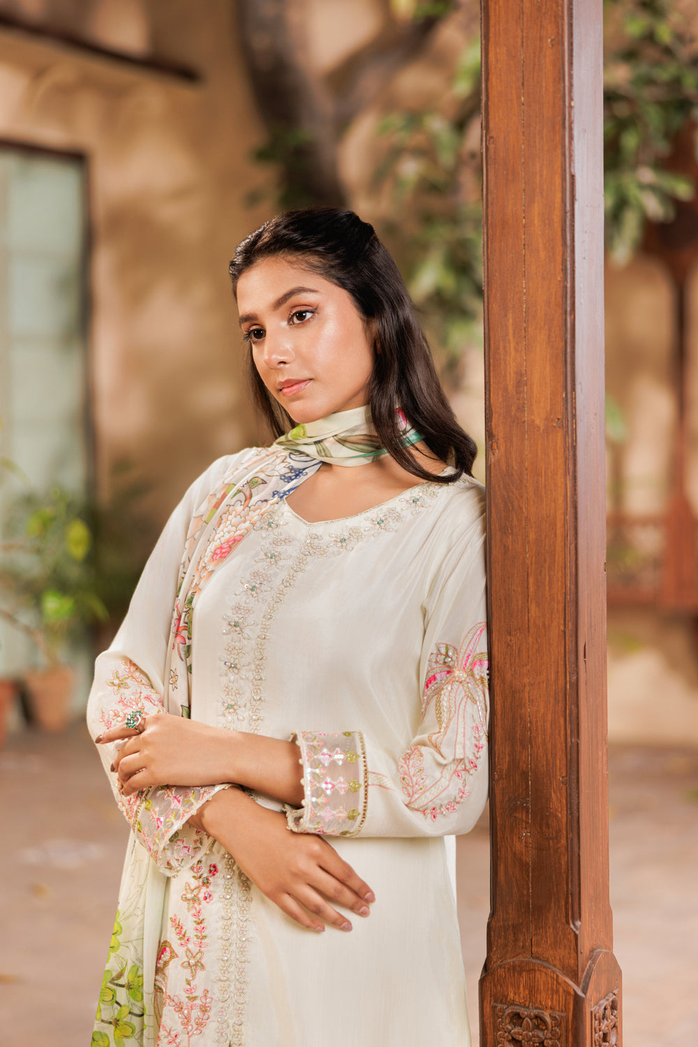 A blend of grace and sophistication, this white 3-piece ensemble is a perfect choice for any occasion. Crafted from breathable Irish summer raw silk, it offers both comfort and elegance. The intricate embroidery and delicate hand embellishments add a luxurious touch, while the printed med silk dupatta enhances its charm.