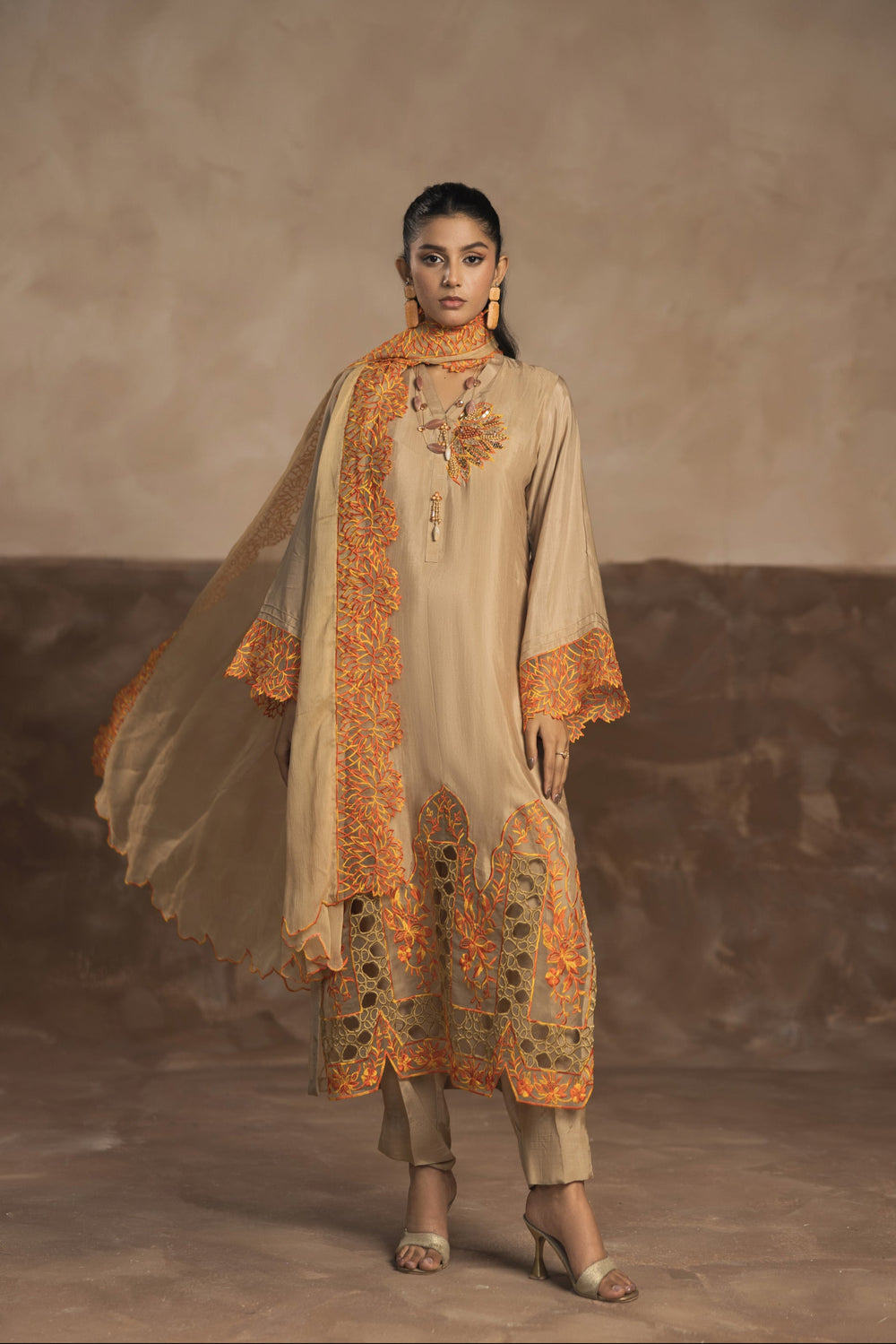 A perfect fusion of tradition and modernity, this golden-hued attire showcases intricate hand embellishments and double-shade orange embroidery, making it a wardrobe essential. The flowing crinkle dupatta with detailed embroidered borders adds an ethereal touch.