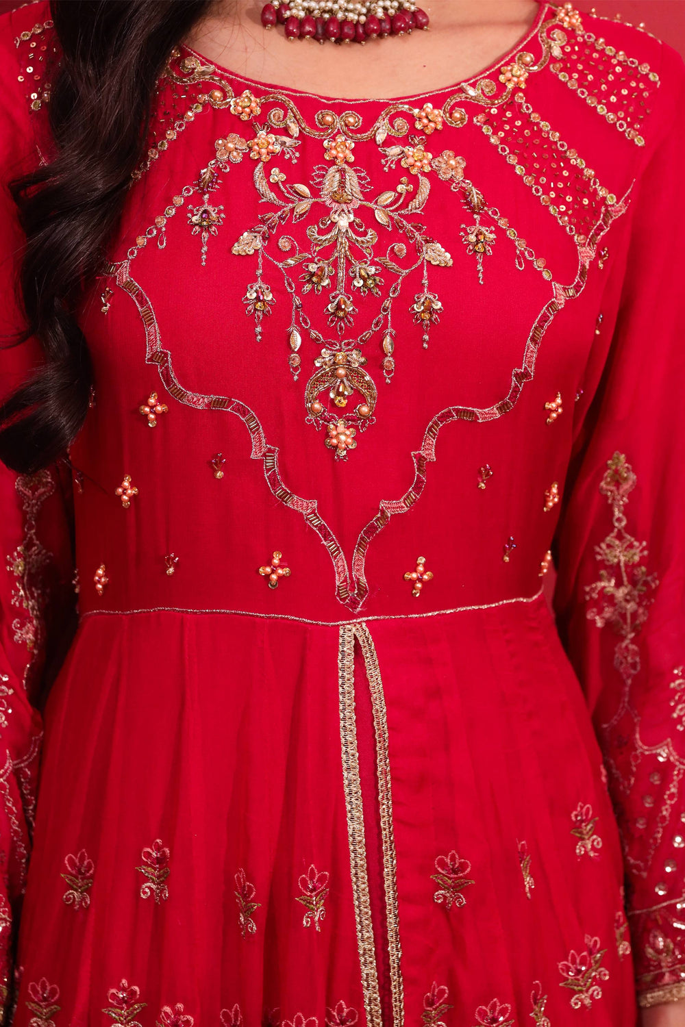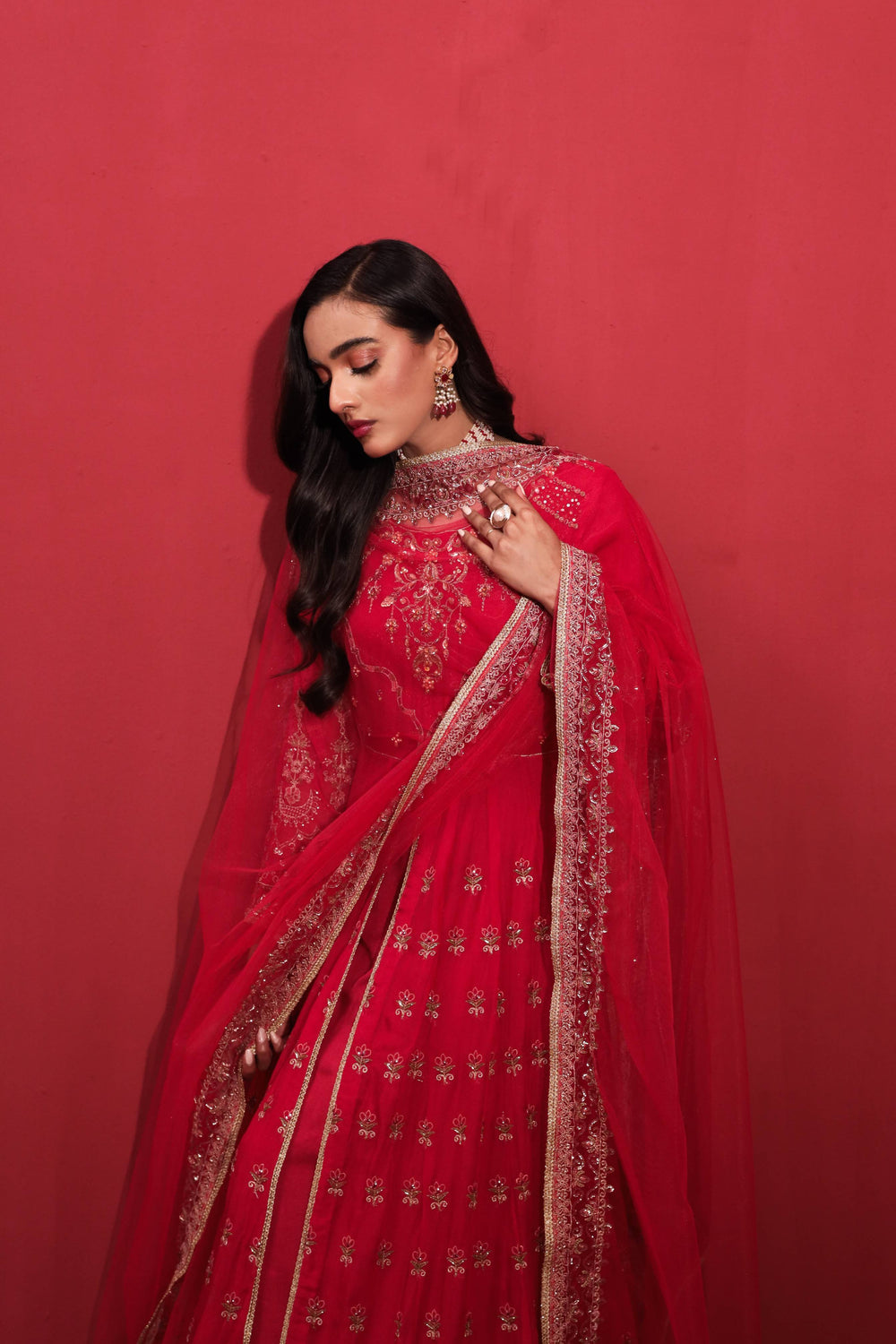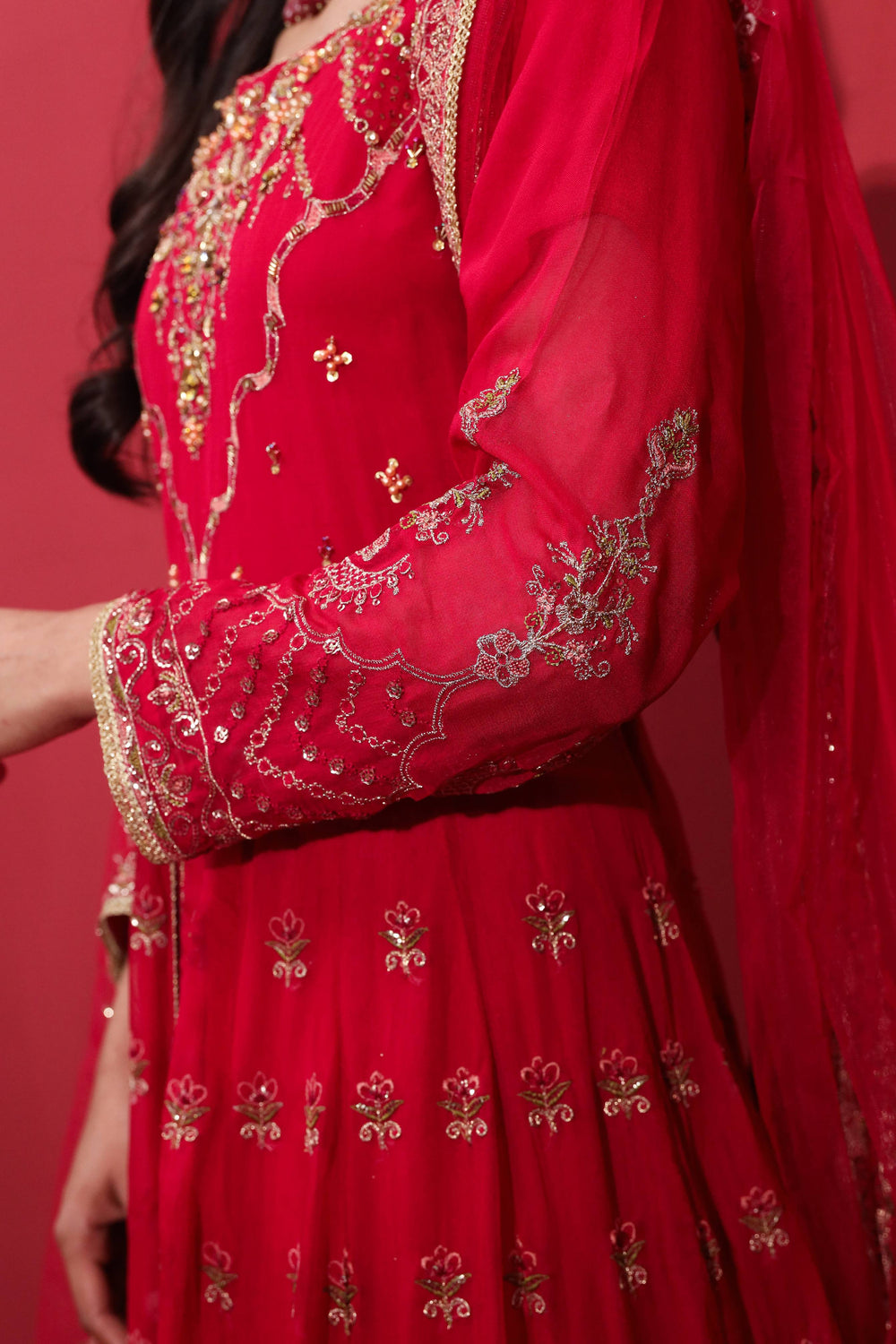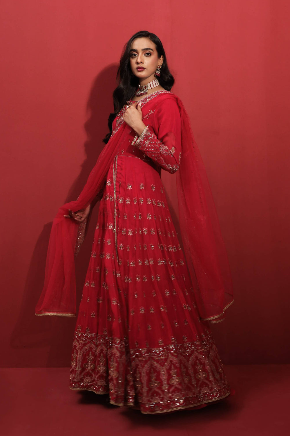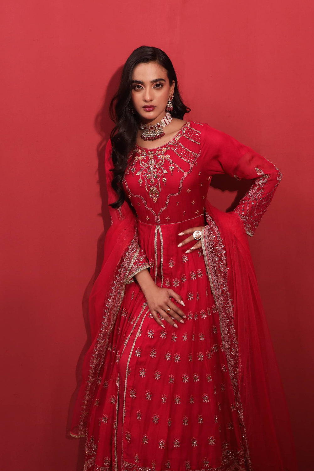 Experience opulence with this charming Ruby Red maxi, crafted from delicate georgette and enriched with intricate gold and silver thread embroidery. The adorned bodice and sweeping flare highlight radiant embellishments and adda craftsmanship that catch the light. Enhanced by a sleek waist and sheer sleeves, it is paired with a net dupatta featuring fine edging, ideal for traditional celebrations and stylish evenings.