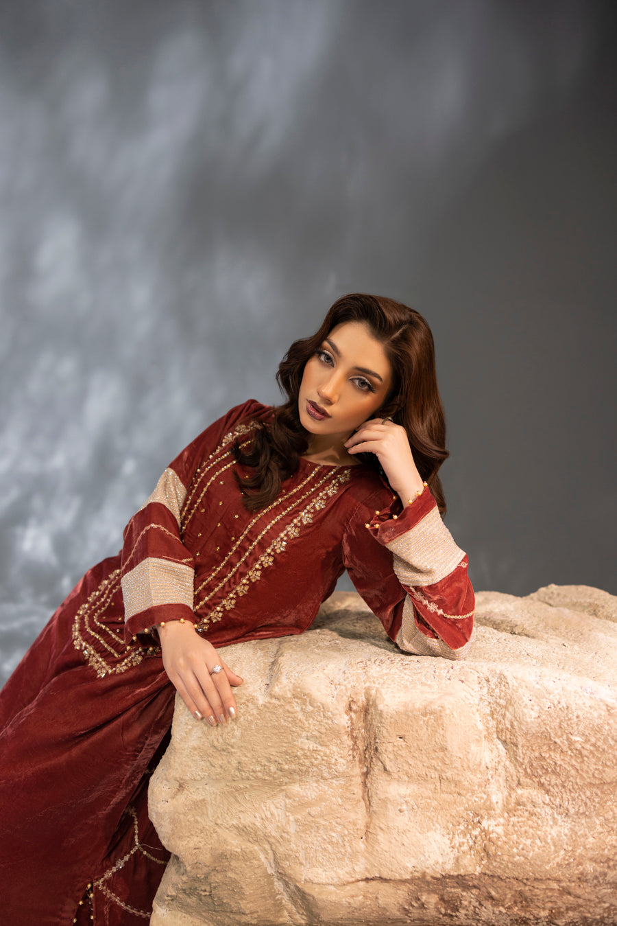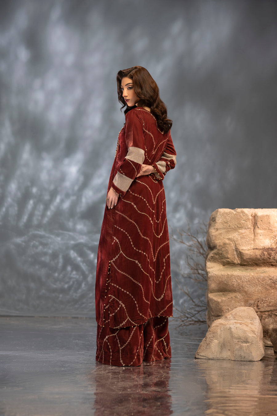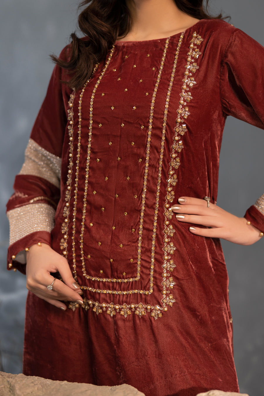 Step into a world of luxury with this exquisite velvet ensemble, designed in a sophisticated tea pink hue. The shirt features a graceful straight silhouette meticulously crafted from premium velvet. It is elevated by intricate embroidery and hand-embellished detailing featuring a delicate mix of pearls, stones, and crystals that catch the light with every movement. With its elegant handwork on both the front and back, this outfit offers a perfect balance of traditional craftsmanship and modern sophistication—making it an ideal choice for festive evenings and formal winter gatherings.