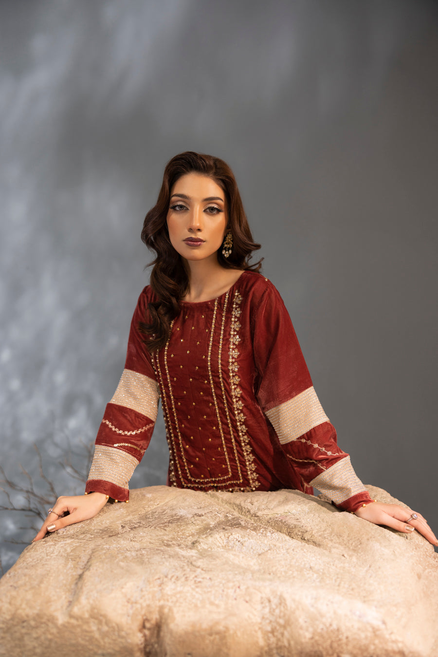 Product Includes: Shirt and Embroidered Velvet Culottes.