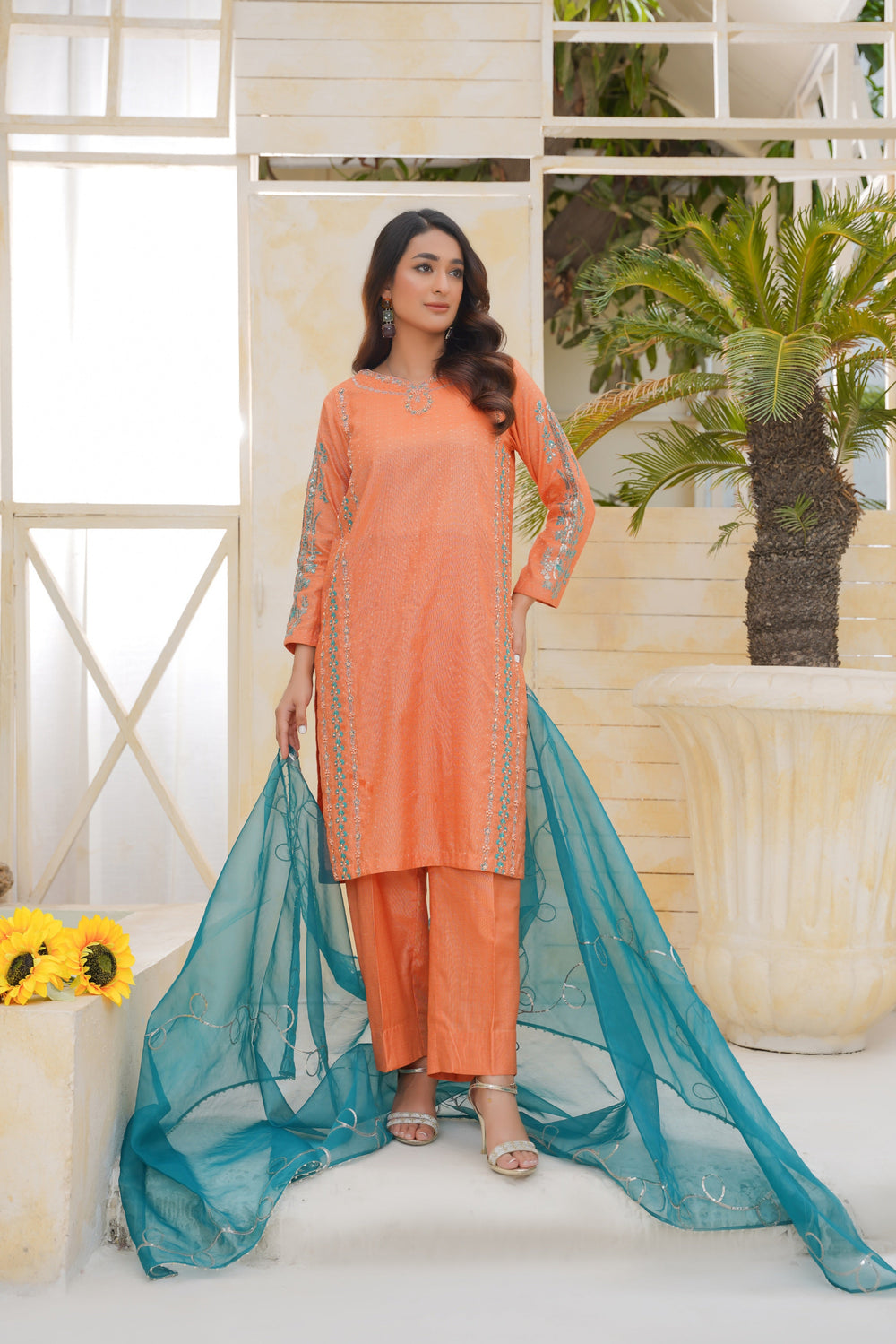 A bold and elegant orange 3-piece ensemble crafted with a dot masori lawn shirt, adorned with delicate embroidery and embellishments using stones and pearls on the front and neckline. Paired with a masori trouser and a contrast organza dupatta for a graceful finish.