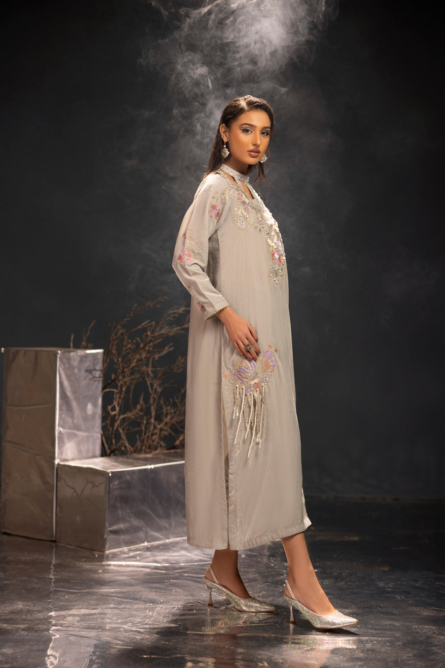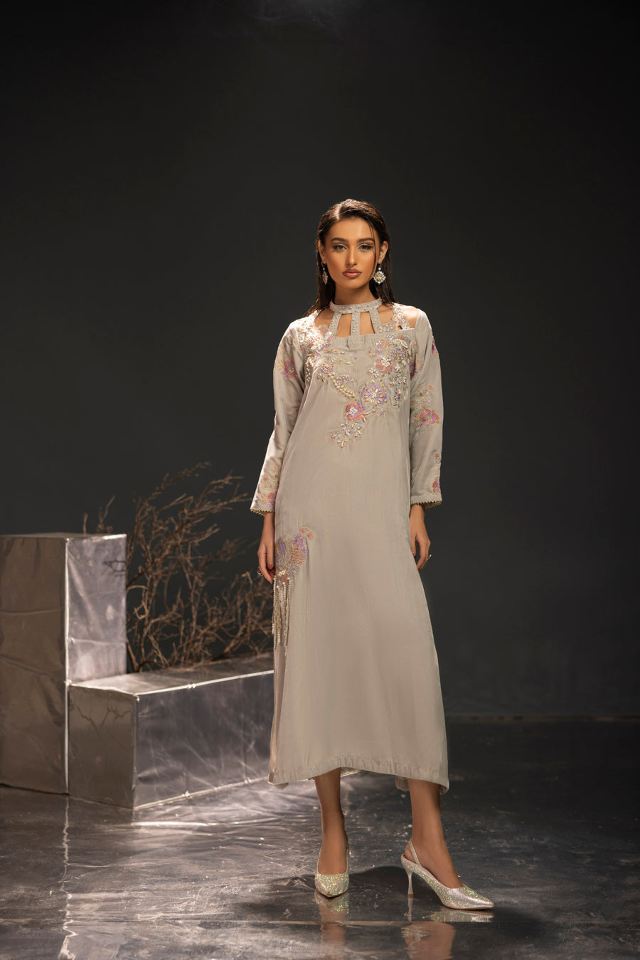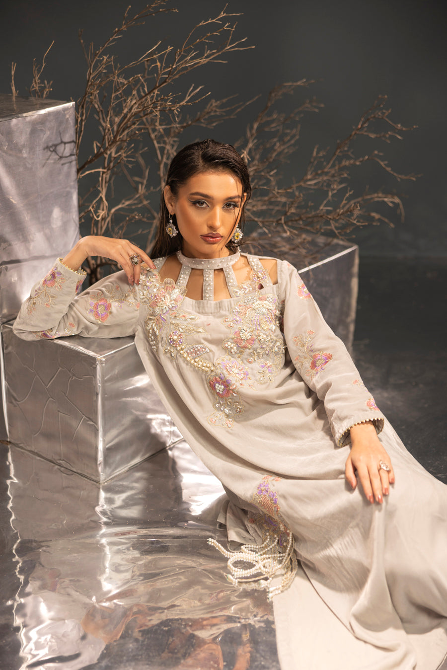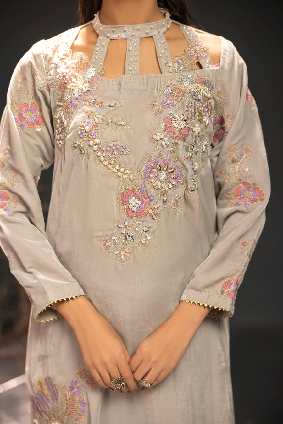 Embellishment: Intricate embroidery and hand embellishments featuring pearls, stones, and crystals