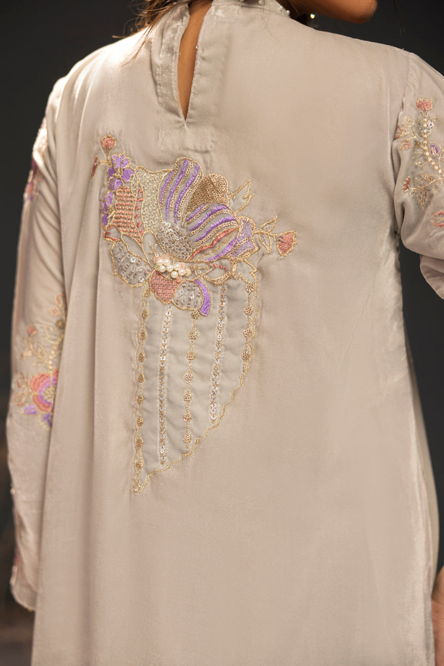 The shirt is meticulously crafted from premium velvet, featuring a sophisticated straight silhouette that offers both grace and comfort. This masterpiece is elevated with intricate embroidery and elaborate hand-embellished detailing, using a luminous blend of pearls, stones, and crystals that create a radiant finish. With its unique neck detail and exquisite craftsmanship on the front, back, and sleeves, this outfit is a timeless choice for festive evenings and formal gatherings.