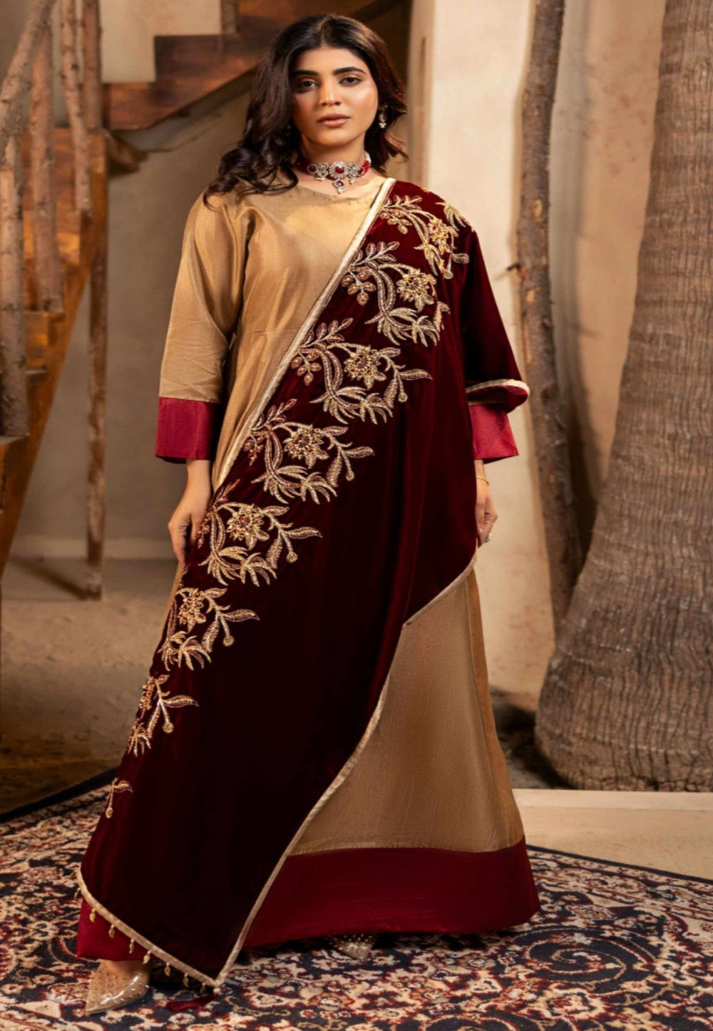 Elevate your style with this stunning hand-embellished velvet maroon staller. Featuring intricate embroidery work, this elegant staller adds a touch of luxury to any outfit. Its rich velvet fabric ensures a premium look and feel, making it the perfect accessory for formal and semi-formal occasions.