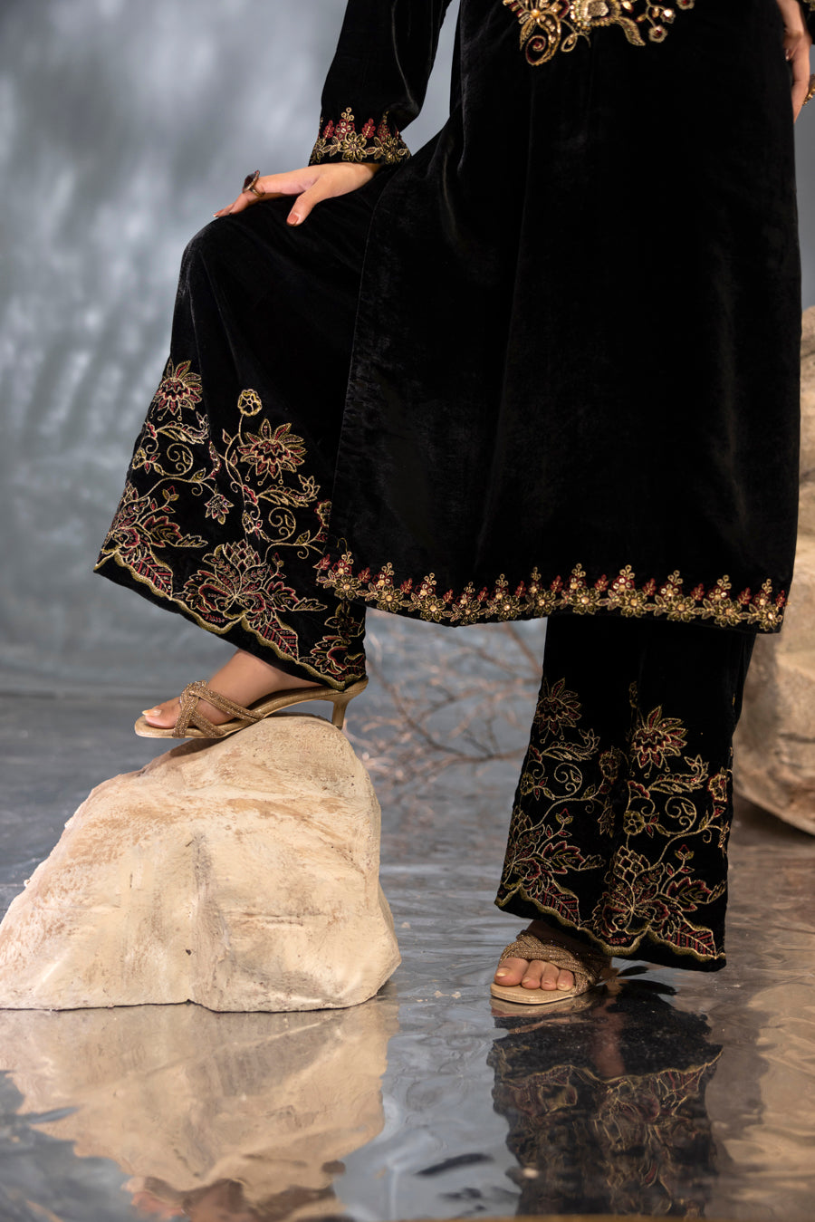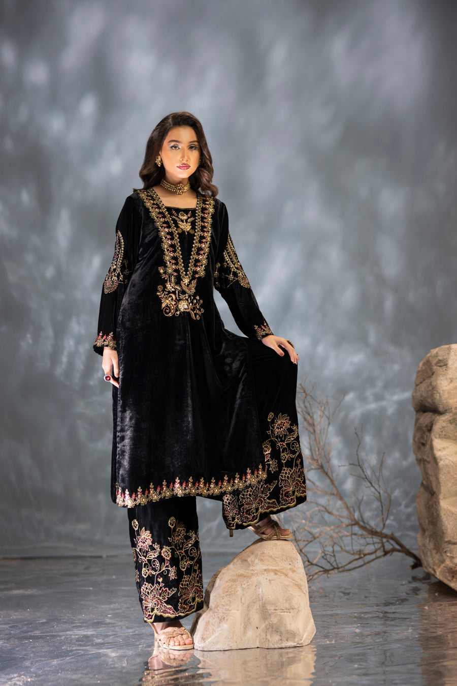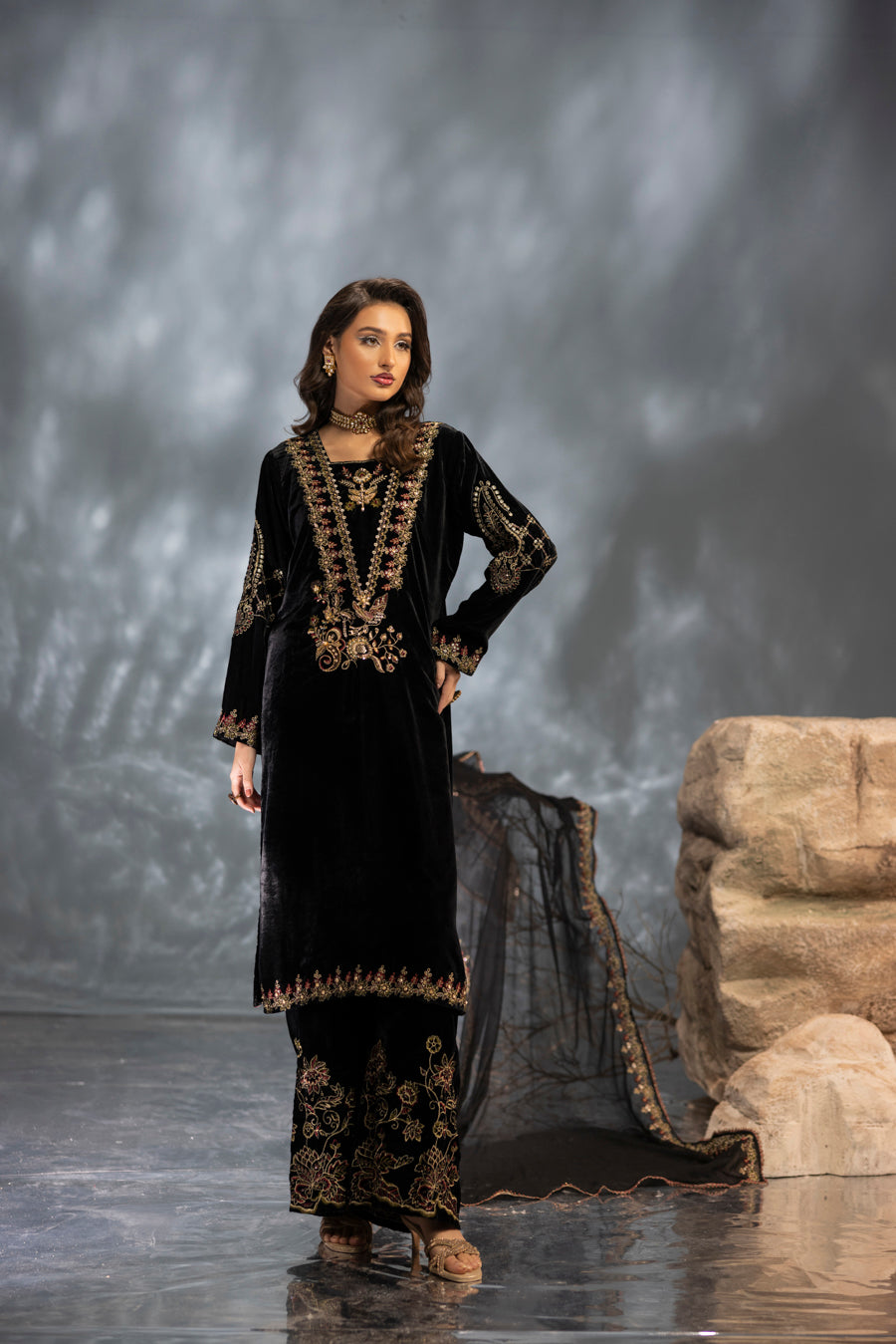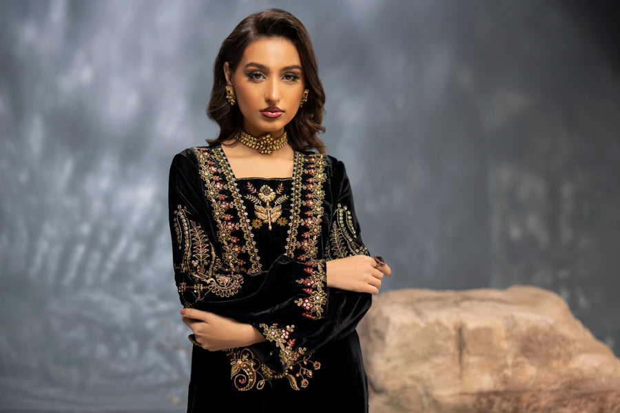 Product Includes: Embroidered Velvet Shirt, Embroidered Velvet Culottes, and Embroidered Krinkle Dupatta