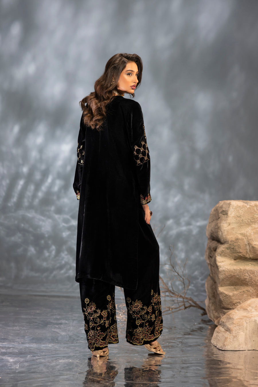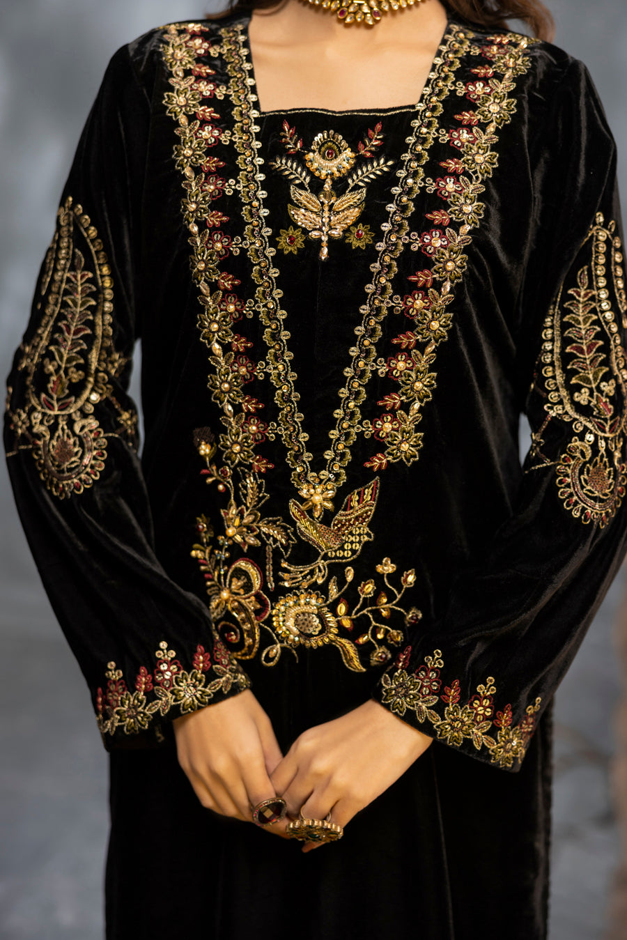 Indulge in the pinnacle of sophistication with this striking black velvet ensemble. The shirt is masterfully tailored from premium velvet, showcasing a sleek silhouette that offers both luxury and grace. This statement piece is defined by its intricate embroidery and elaborate hand-embellished detailing. Using a refined technique, the design incorporates a unique combination of pearls, stones, and crystals arranged in a captivating, multi-dimensional pattern. With rich artistry spanning the front, back, and sleeves, this outfit is a bold and timeless choice for high-end festive events and winter galas.