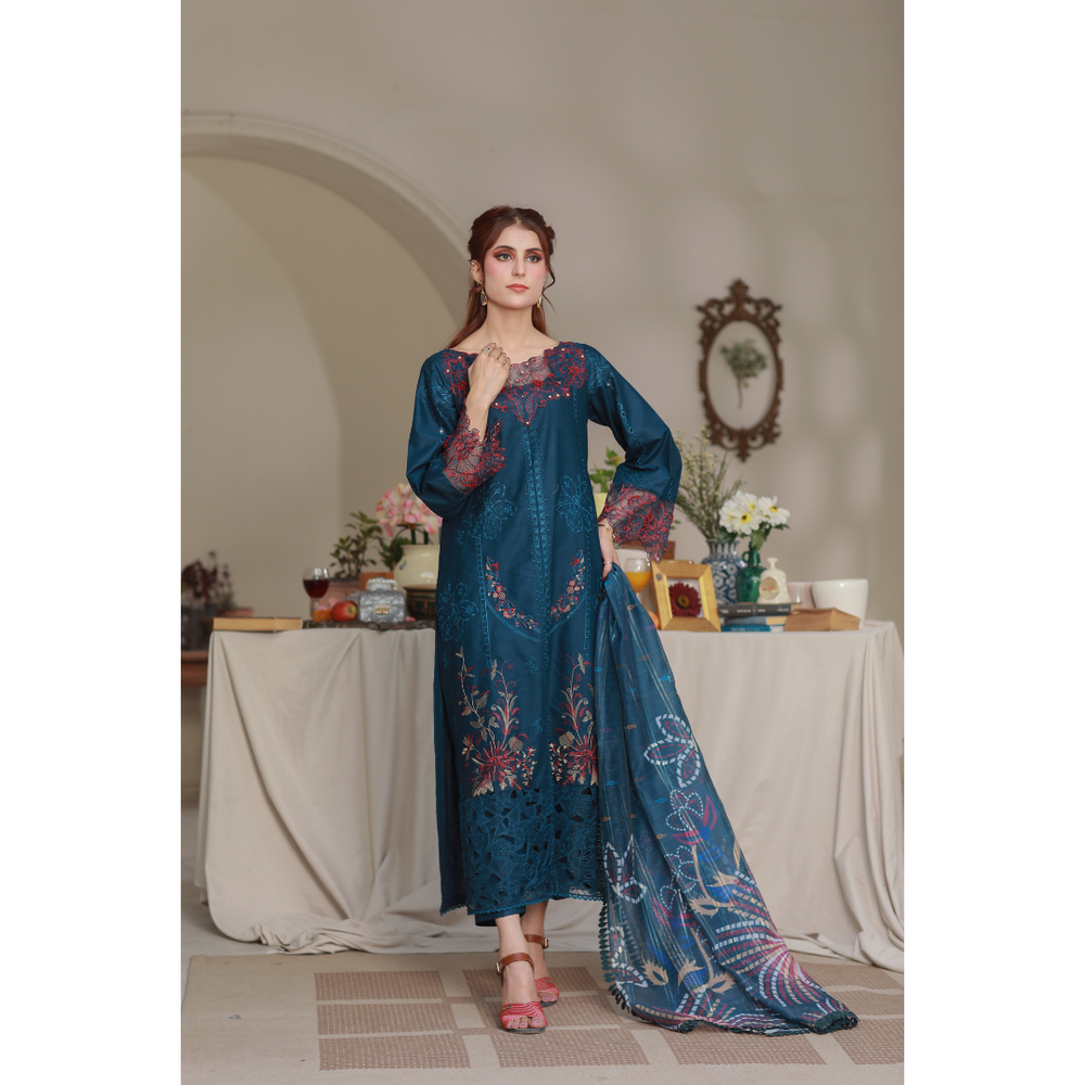 The stunning blue outfit highlighted with intricate red n blue mix embroidered details with neck organza patched and stone studded neckline with digital printed geometrical floral dupatta. Completing the outfit with the same color pants.