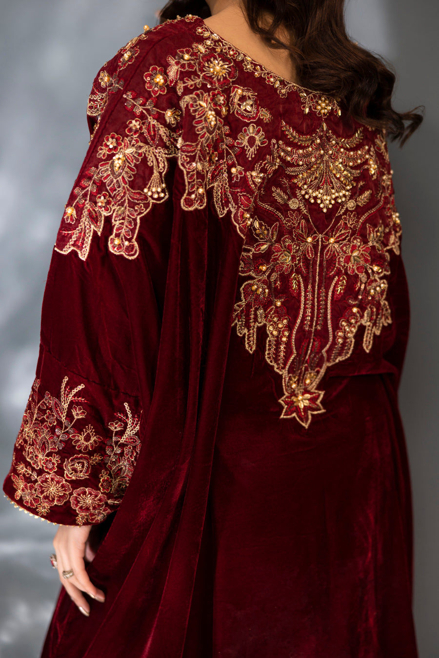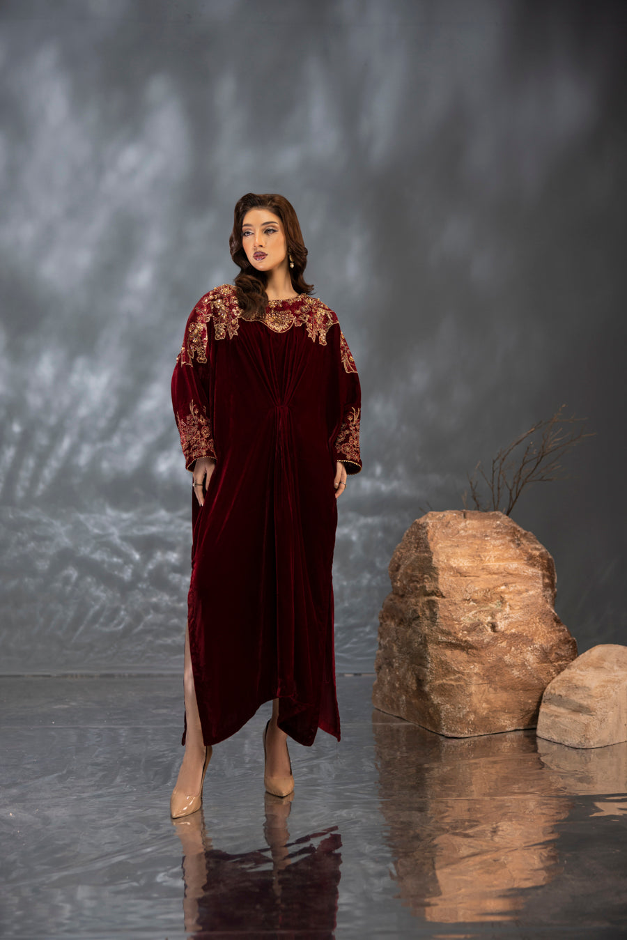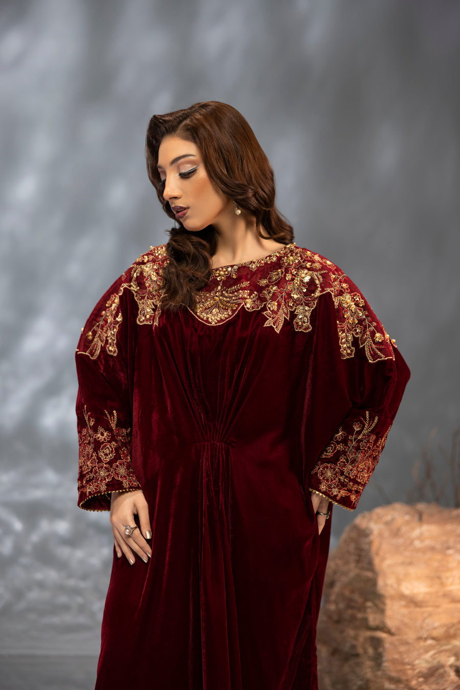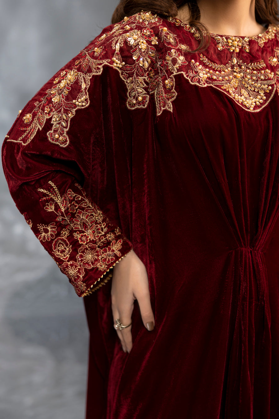 Indulge in the splendor of this majestic maroon velvet kaftan, a true masterpiece of craftsmanship. This single-piece ensemble features a rich, flowing silhouette designed in premium velvet for a regal look. The neckline and shoulders are artfully adorned with intricate embroidery and elaborate hand-embellished detailing. Using a refined technique, the design incorporates a shimmering array of pearls, stones, and crystals that create a stunning, multi-dimensional pattern against the deep maroon base. Perfect for formal winter evenings, this kaftan offers a blend of bold elegance and effortless grace.