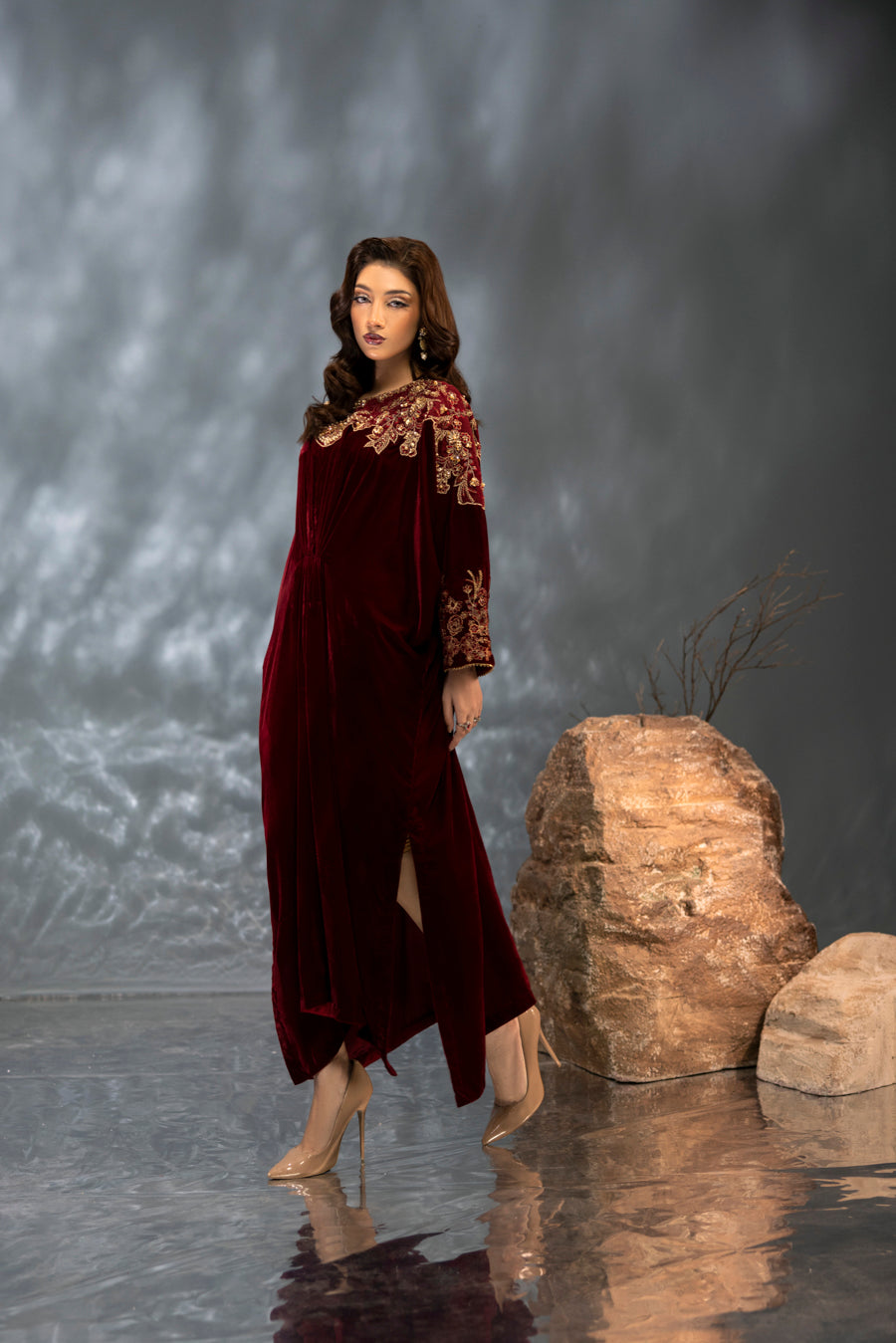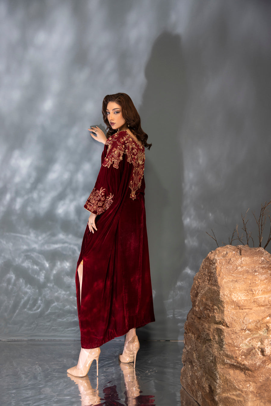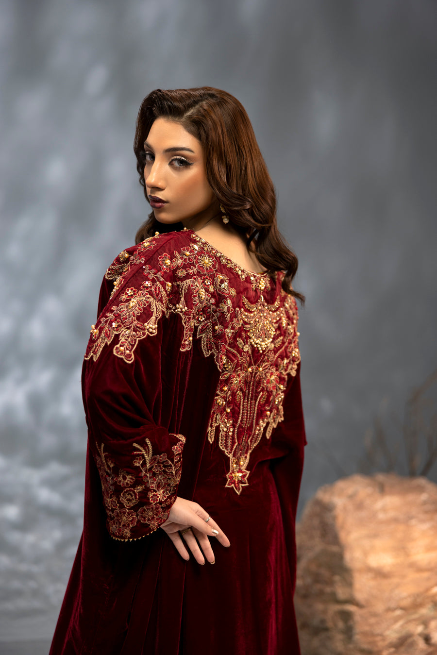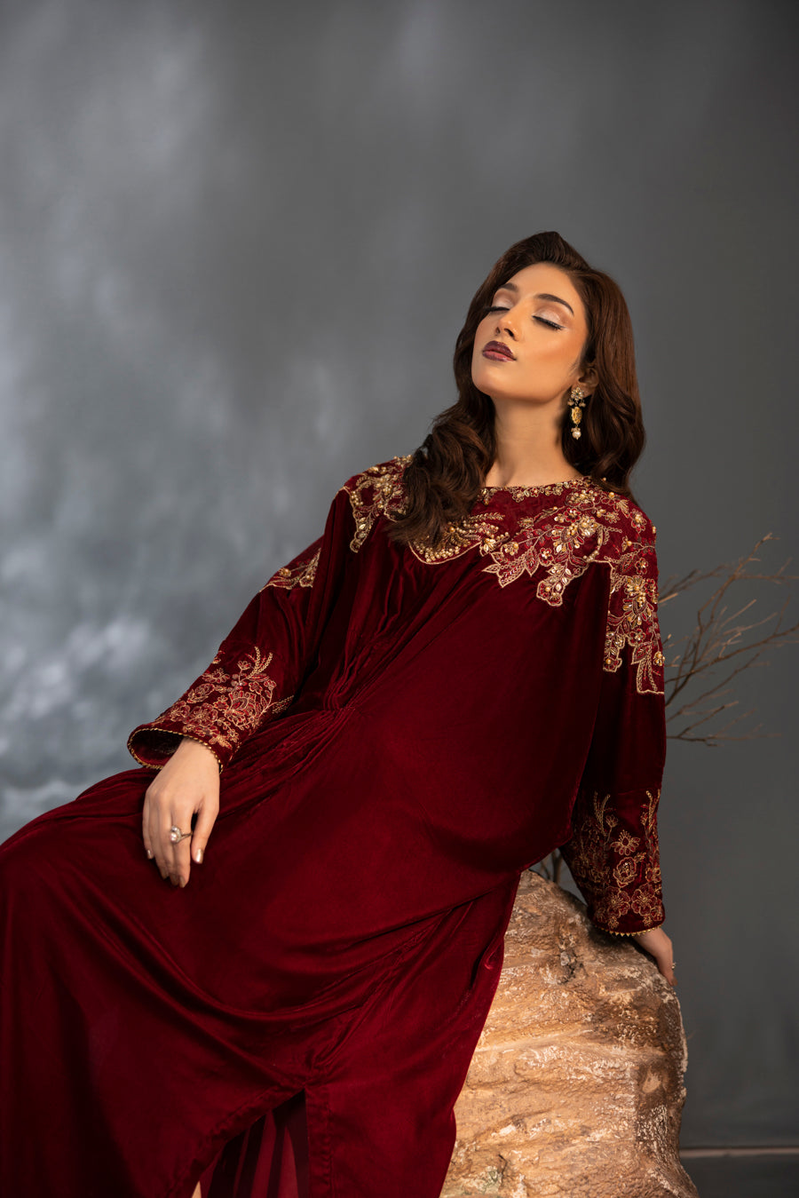 Indulge in the splendor of this majestic maroon velvet kaftan, a true masterpiece of craftsmanship. This single-piece ensemble features a rich, flowing silhouette designed in premium velvet for a regal look. The neckline and shoulders are artfully adorned with intricate embroidery and elaborate hand-embellished detailing. Using a refined technique, the design incorporates a shimmering array of pearls, stones, and crystals that create a stunning, multi-dimensional pattern against the deep maroon base. Perfect for formal winter evenings, this kaftan offers a blend of bold elegance and effortless grace.