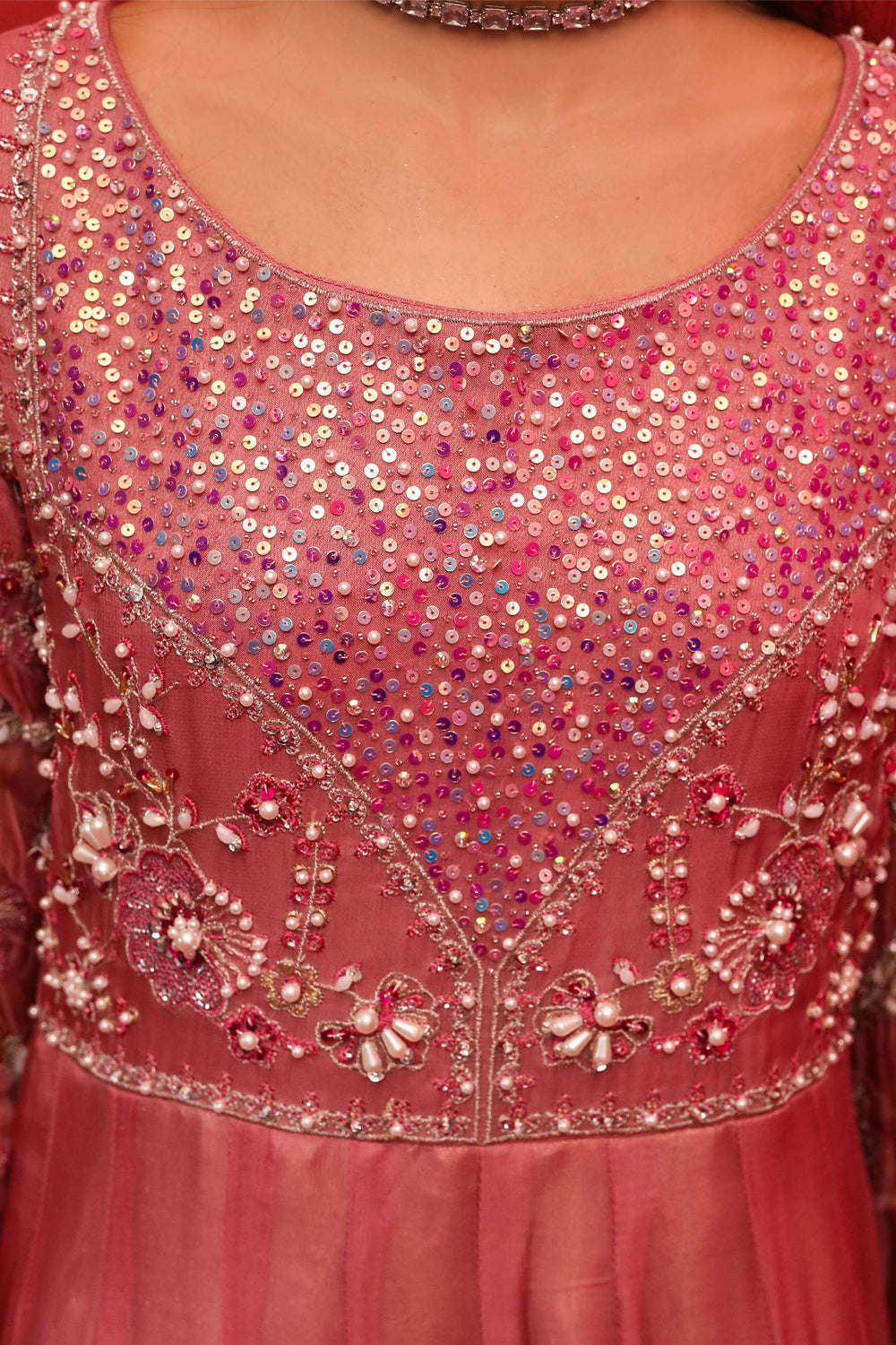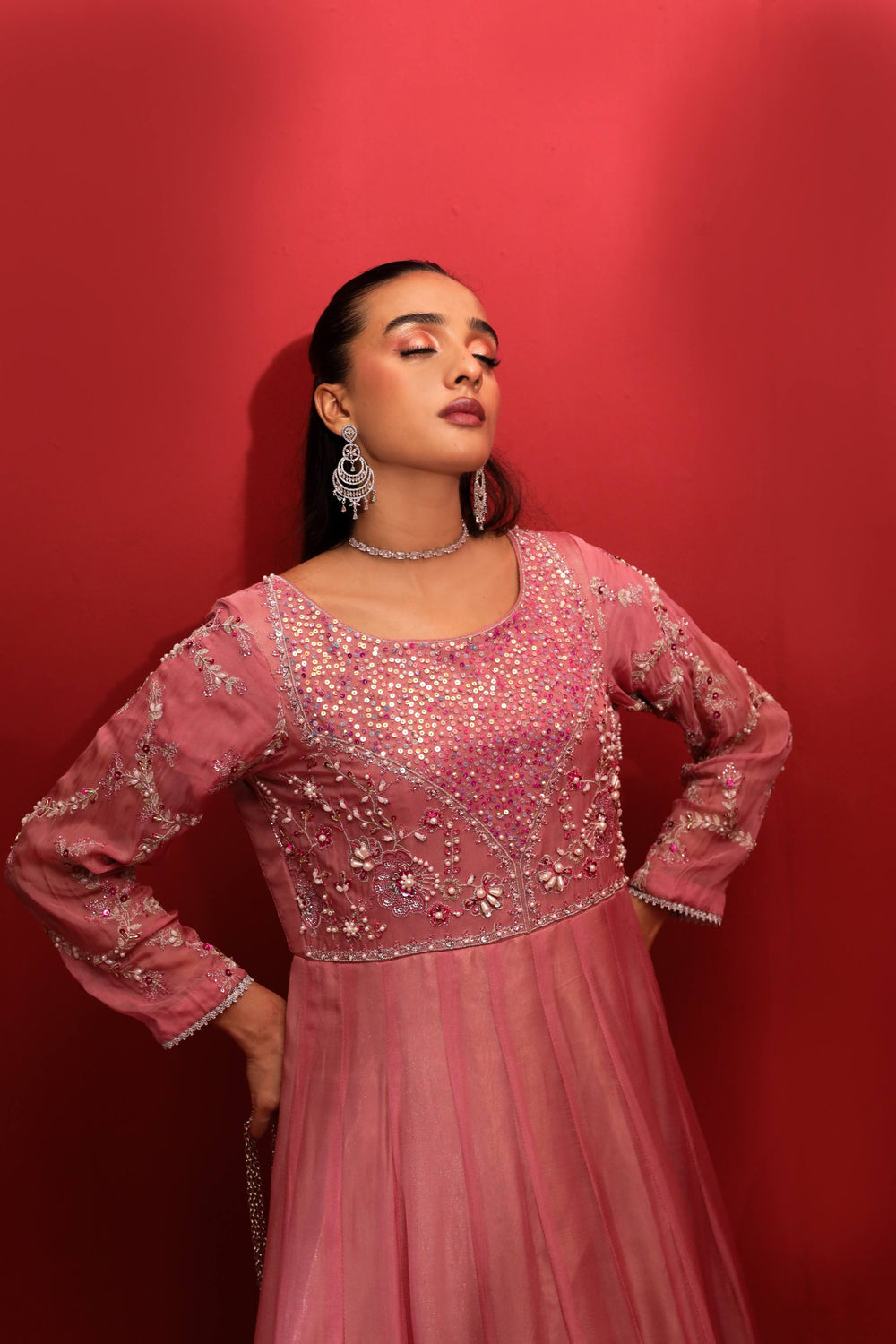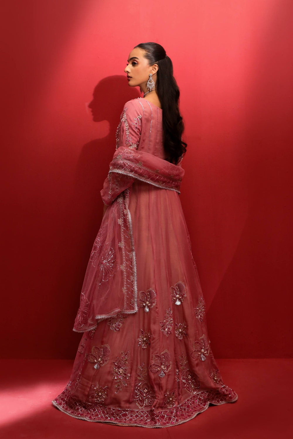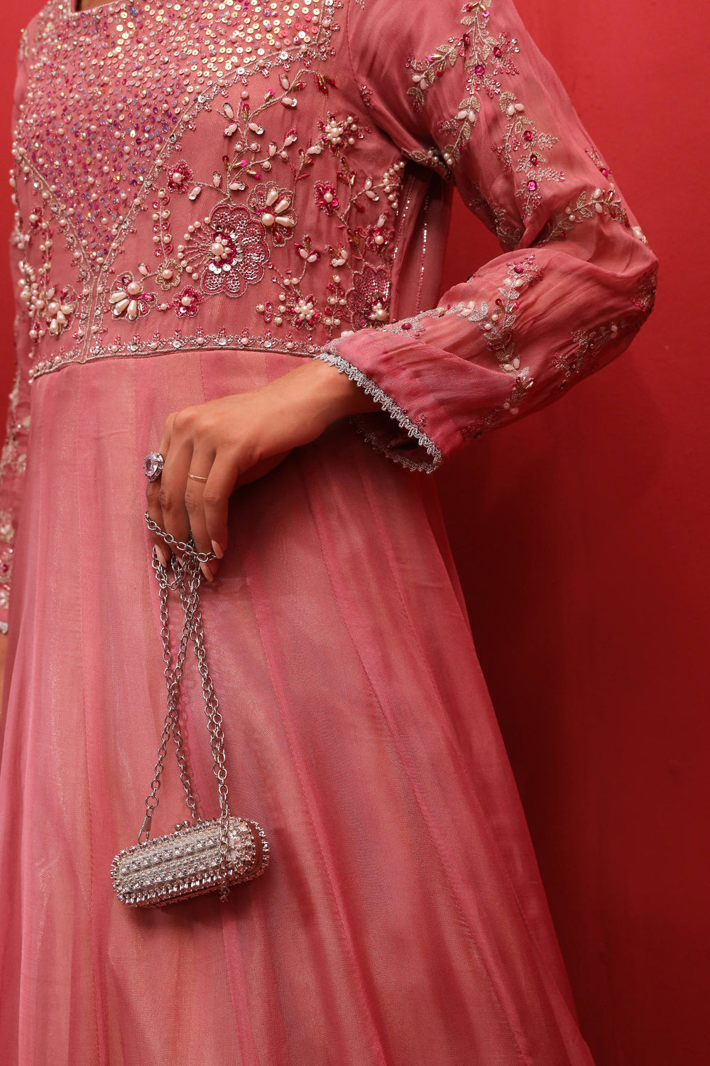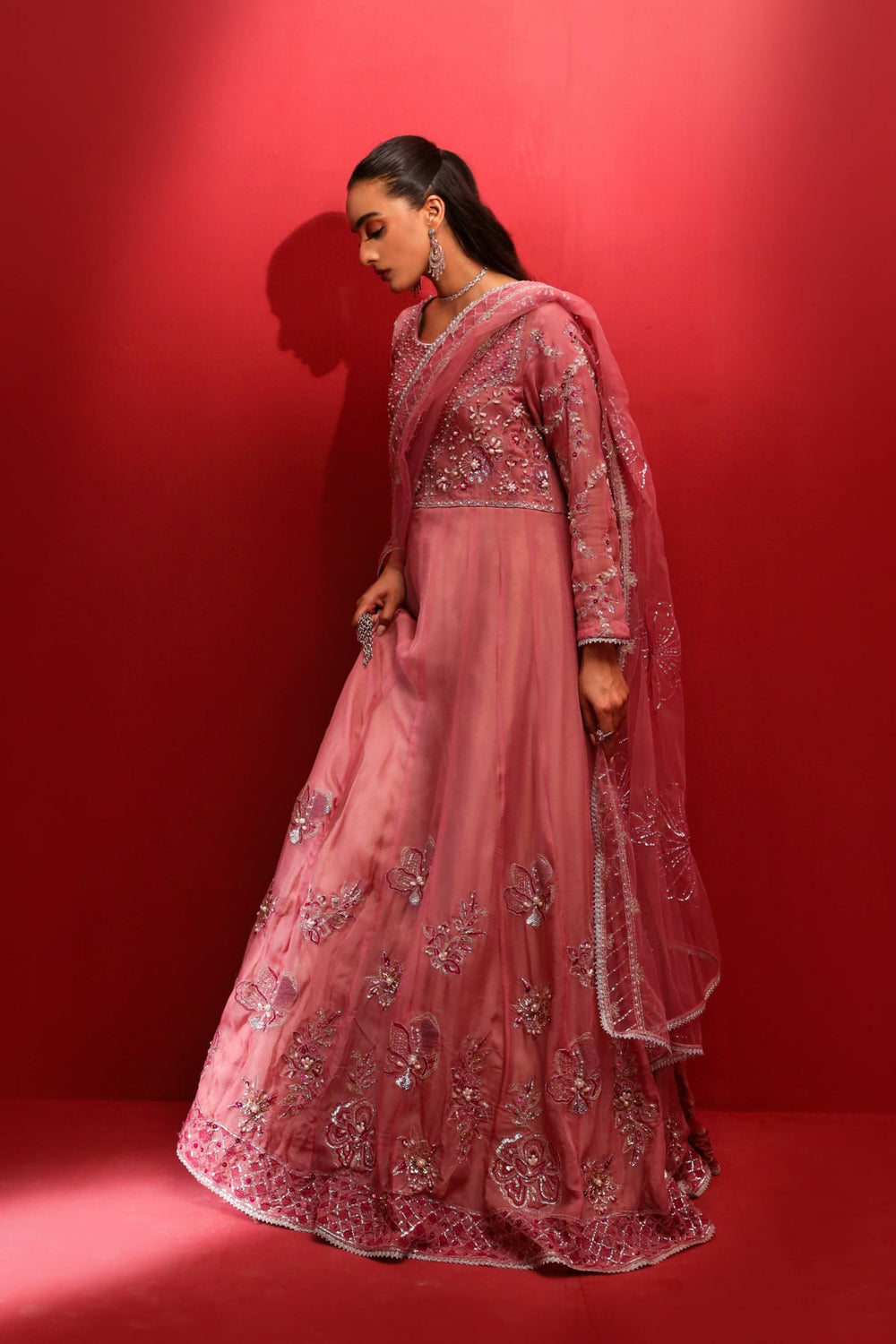 Revel in elegance with this magnificent Peach Elegance maxi, sewn from soft georgette and enhanced with exquisite gold and silver thread embellishments. The adorned bodice and expansive flare display sparkling details and adda work that reflect light gracefully. Paired with a fitted waist and sheer sleeves, the look is crowned with a net dupatta featuring fine borders, ideal for traditional festivities and stylish night outings.
