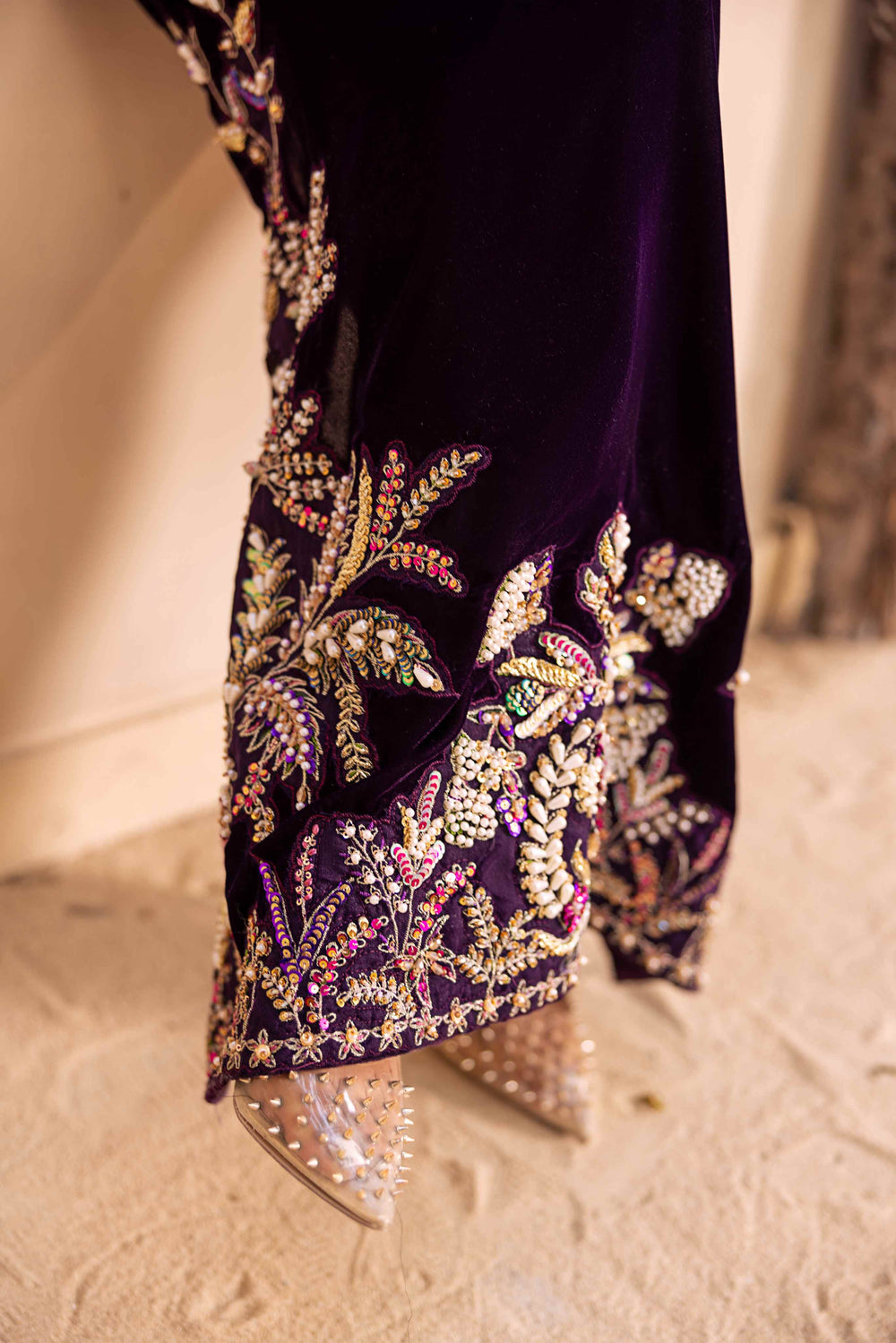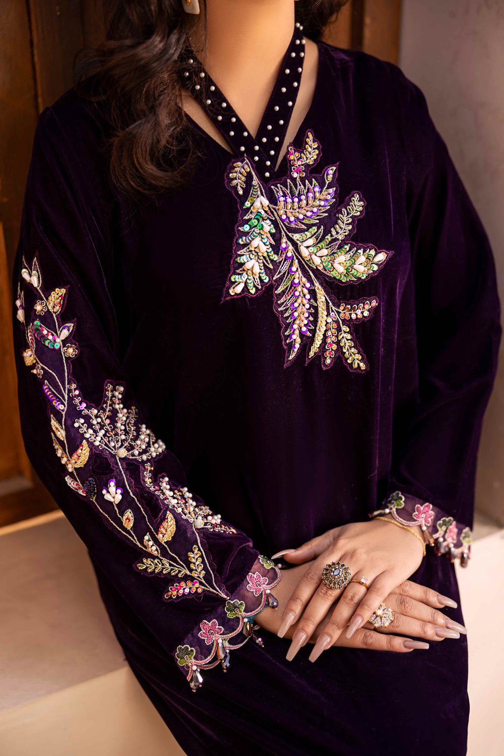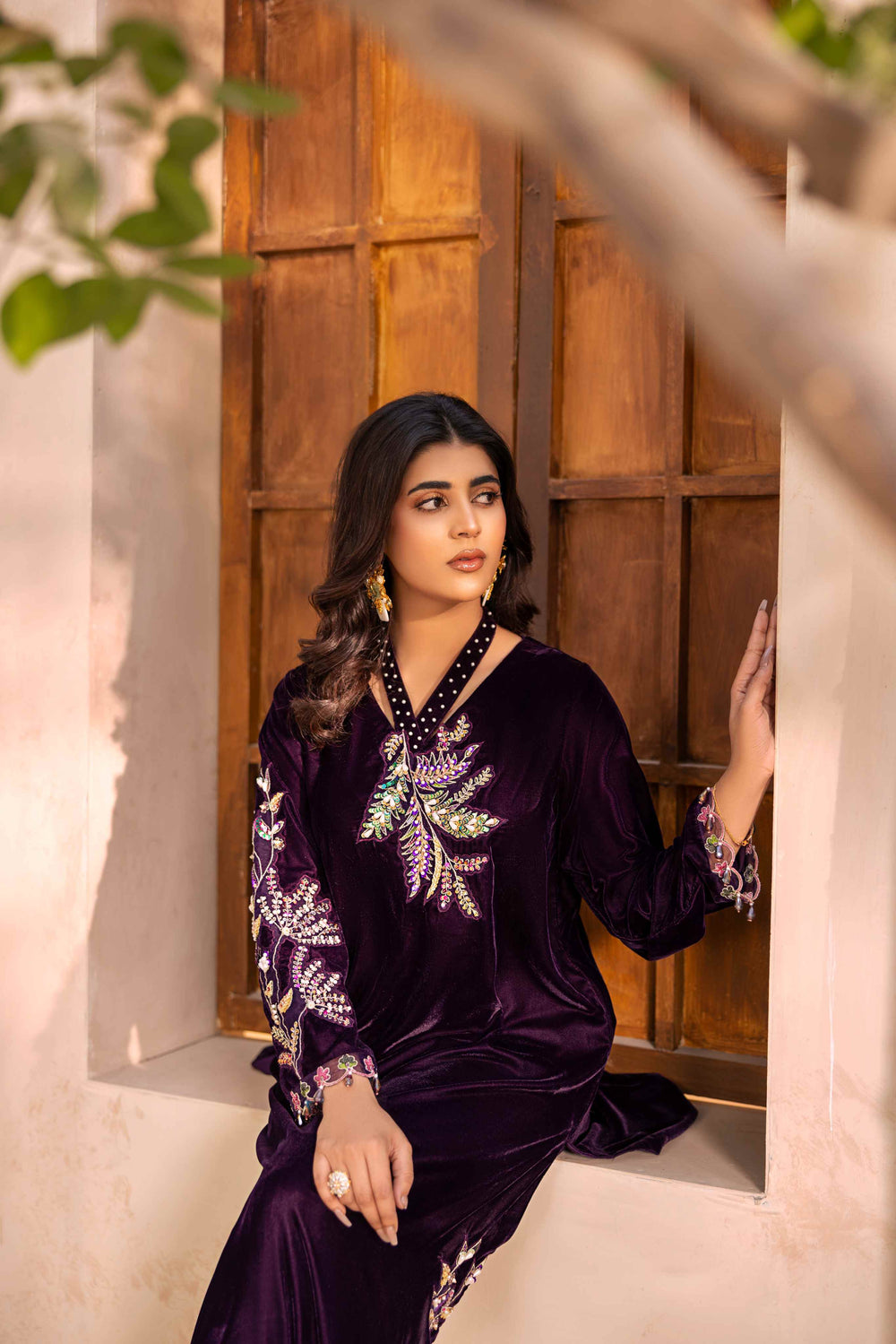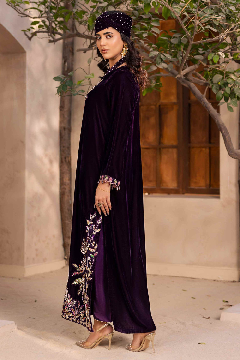 Upgrade your style with this elegant 3-piece purple velvet suit. The long velvet shirt is beautifully hand-embellished with tilla work, sparkling stones, shiny pearls, crystals, and naqshi dabka detailing. It comes with a matching raw silk trouser and a soft silk dupatta, making it a perfect outfit for special occasions.