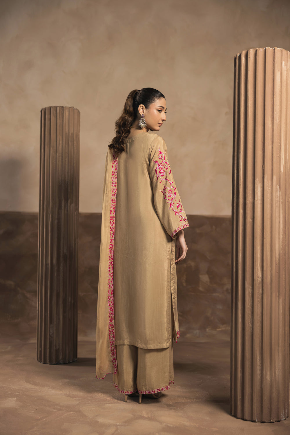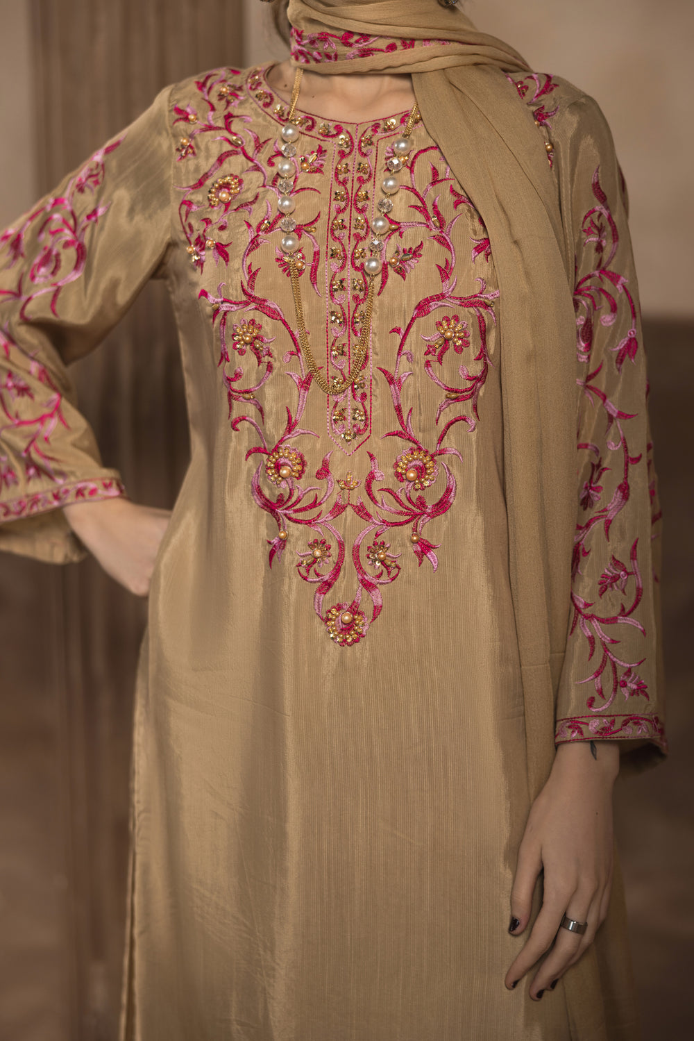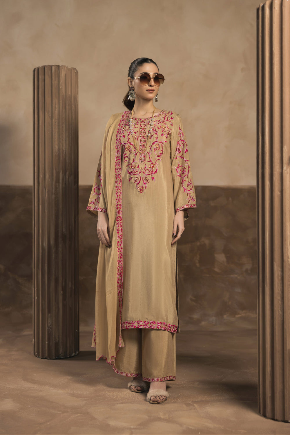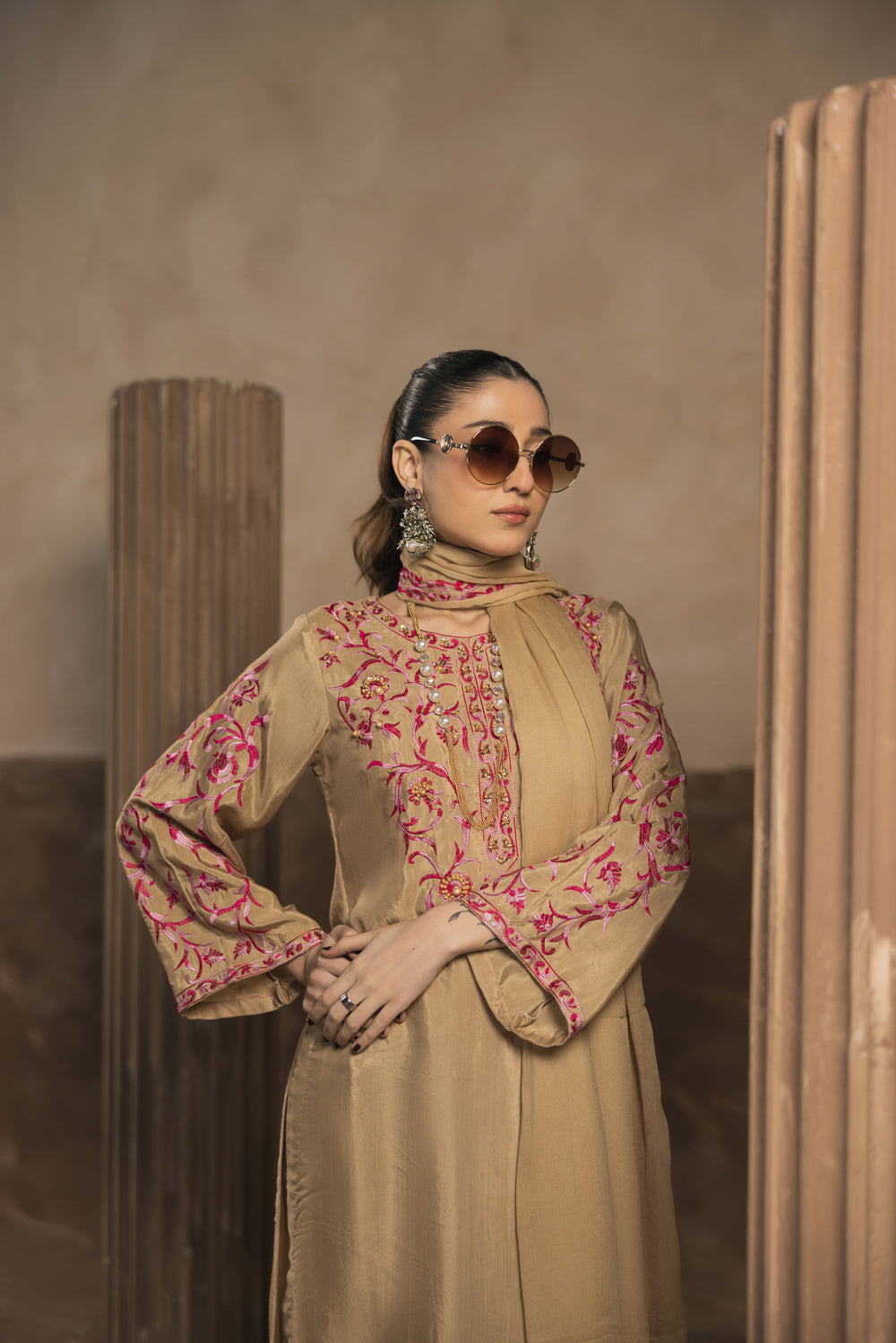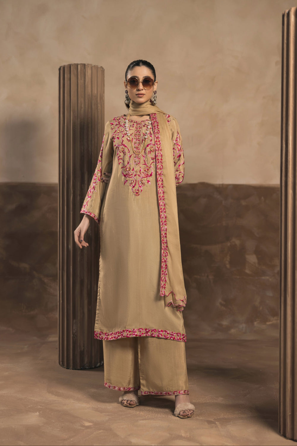 Make a statement with this luxurious 3-piece pink embroidered ensemble in a stunning golden hue. The outfit features intricate double-shade embroidery with elemental hand embellishments, adding elegance and charm. The dyed crinkle dupatta with embroidered borders enhances the overall grace, making it perfect for any special occasion.