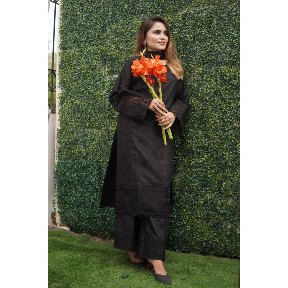 Create a timeless statement with our elegant Black and White Three-Piece Embroidered Suit. Featuring a beautifully embroidered lawn shirt, this outfit is paired with a plain tissue silk dupatta adorned with delicate lace on the edges and comfortable cambric trousers. Perfect for any occasion, this ensemble combines simplicity with sophistication.