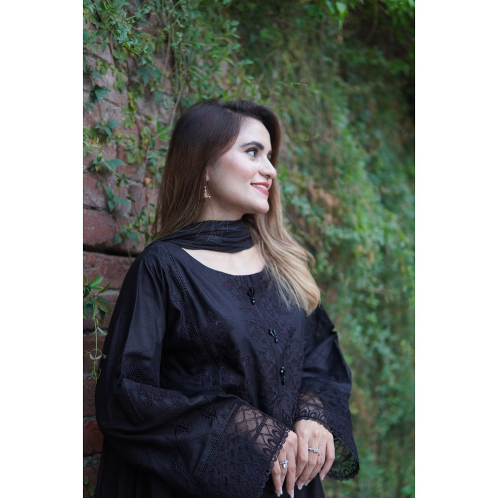 Create a statement with our three-piece embroidered suit in black and white featuring a lawn shirt, Plain tissue silk dupatta lace on edge and cambric trousers.