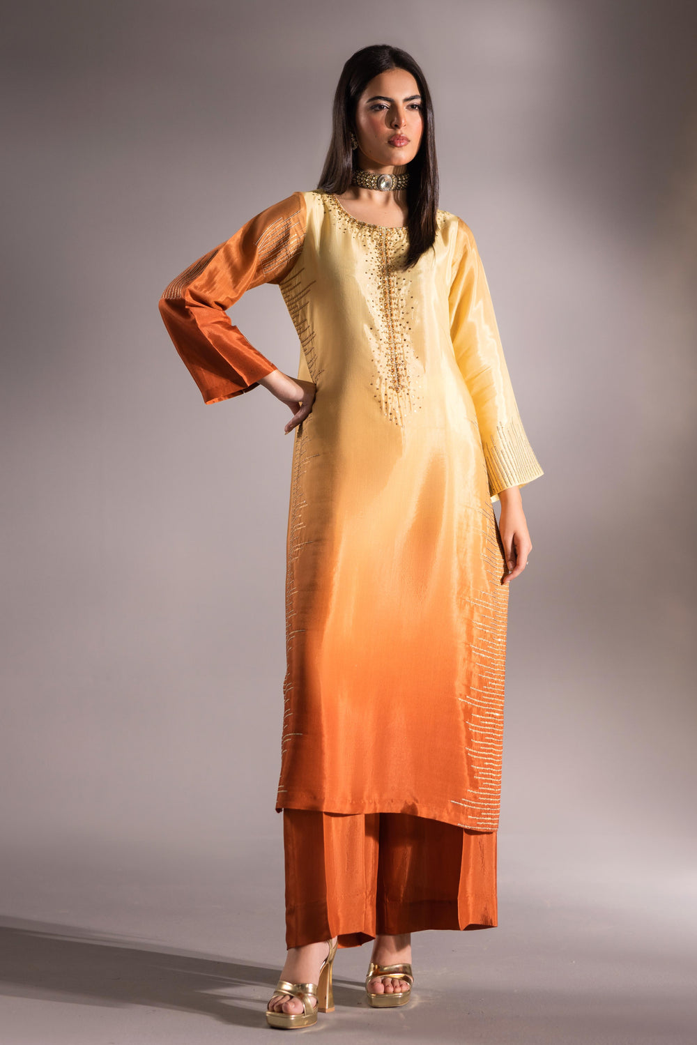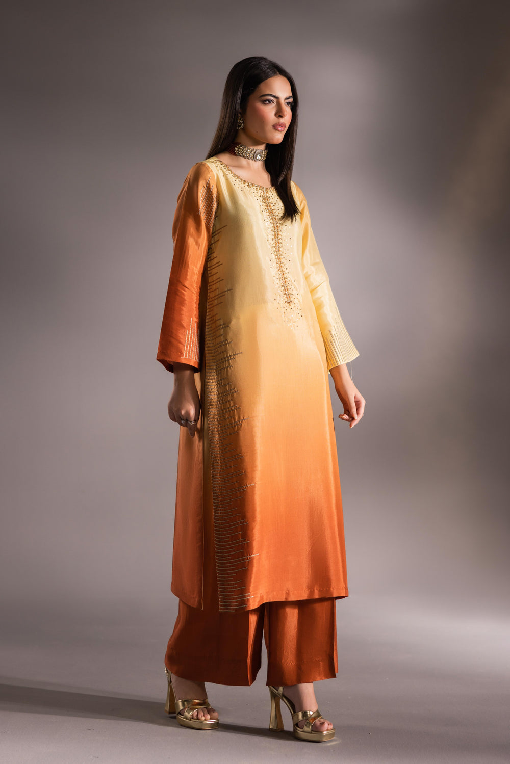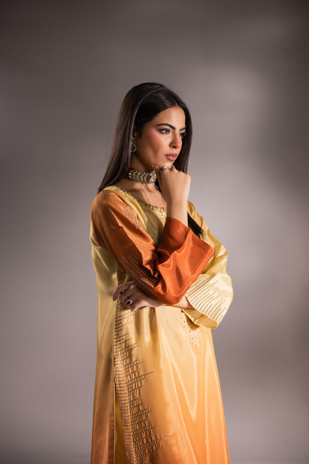 This stunning ensemble features a contemporary ombré design, seamlessly transitioning from a soft, luminous ivory/gold at the neckline to a rich, warm rust or terracotta at the hem.