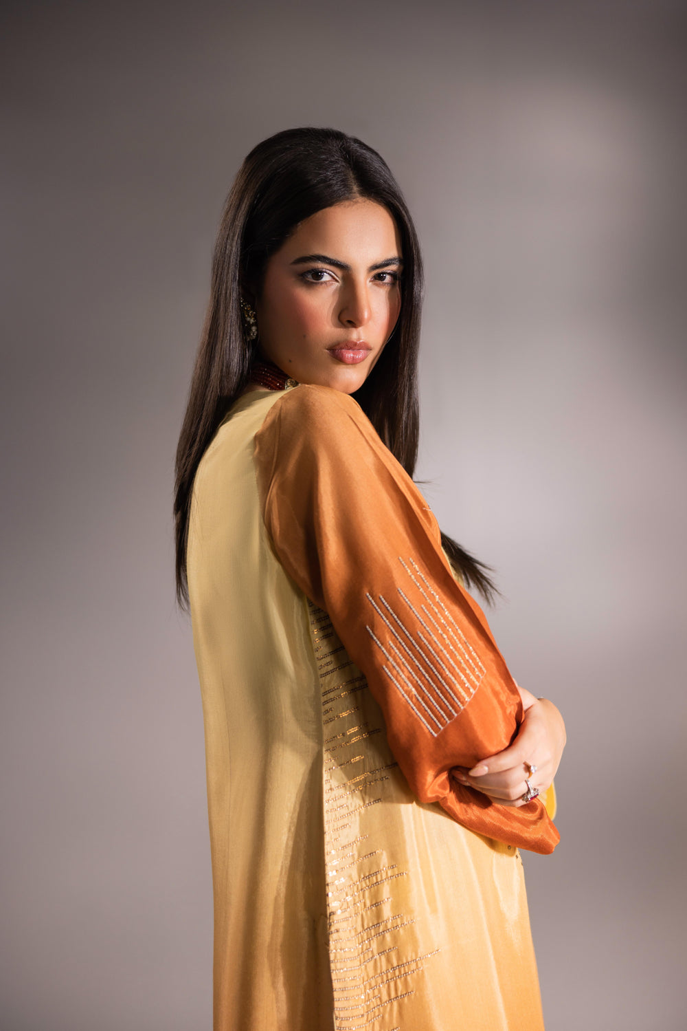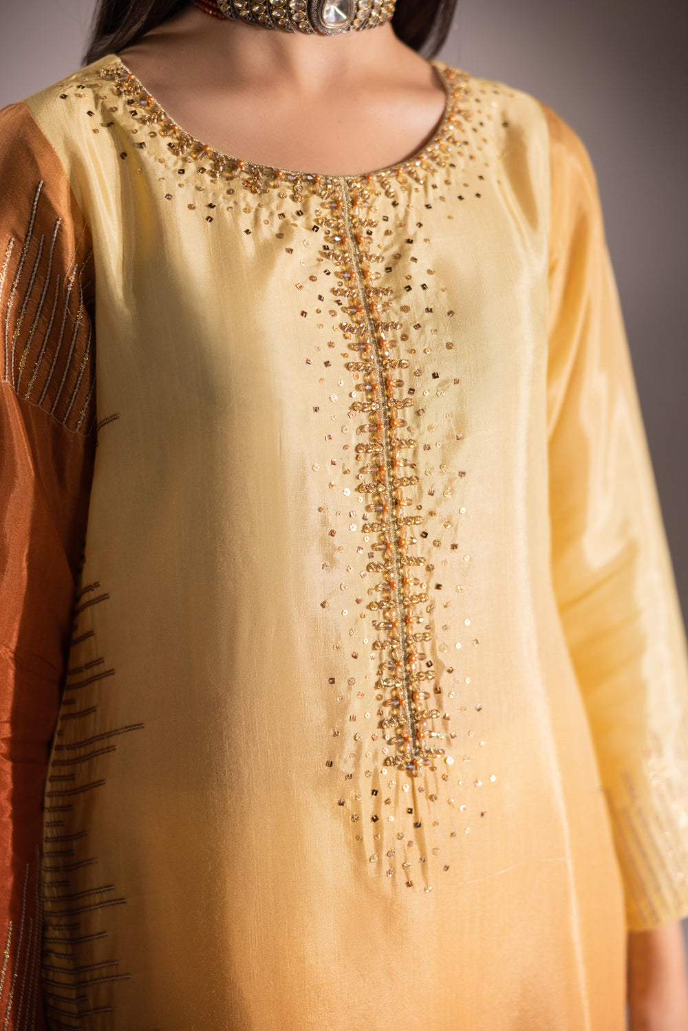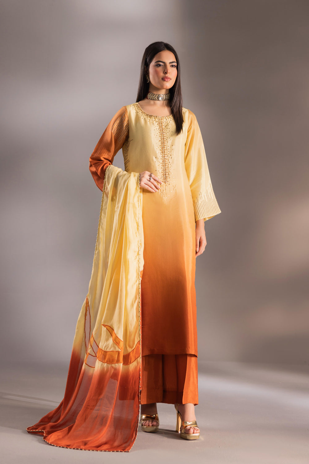 This stunning ensemble features a contemporary ombré design, seamlessly transitioning from a soft, luminous ivory/gold at the neckline to a rich, warm rust or terracotta at the hem.