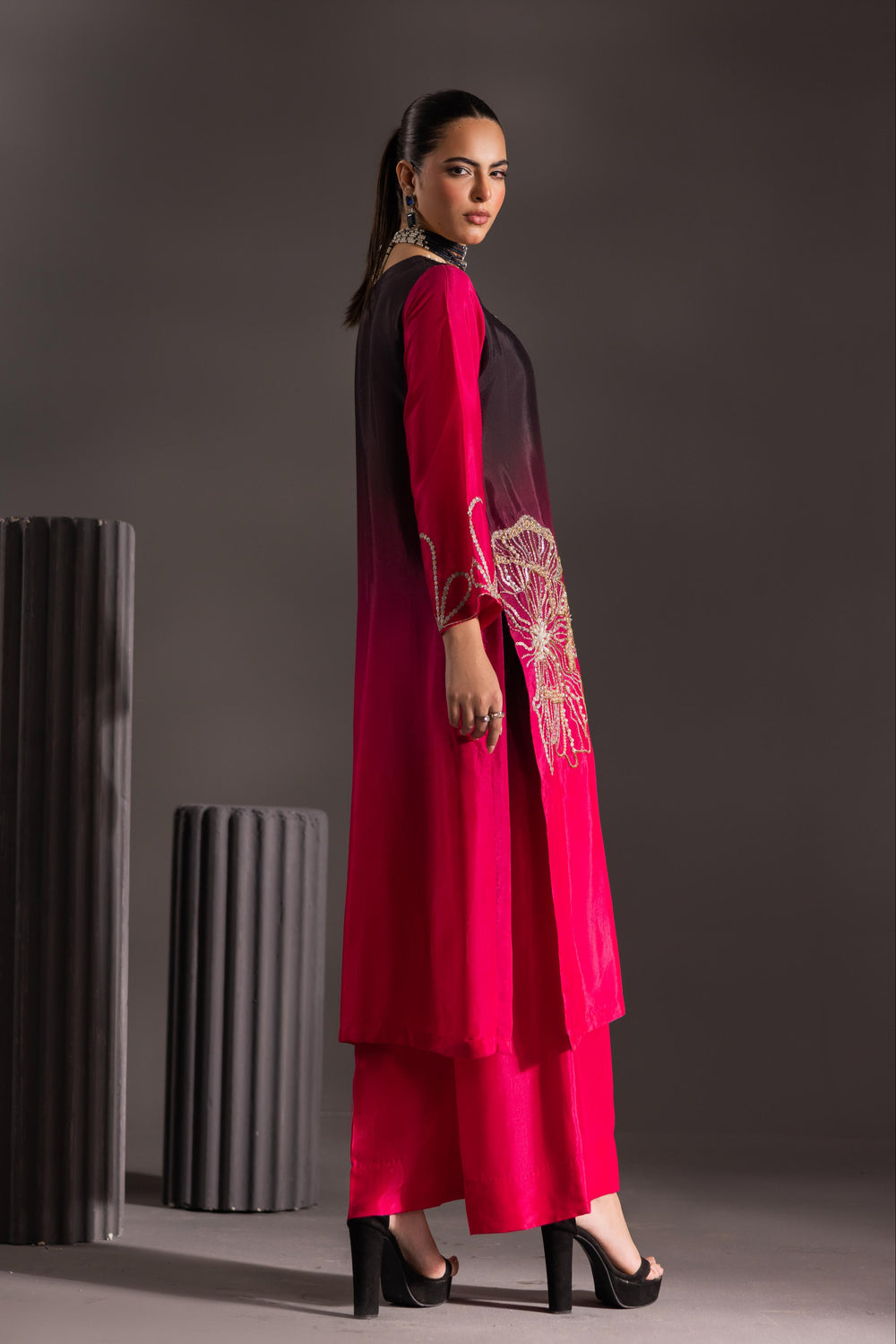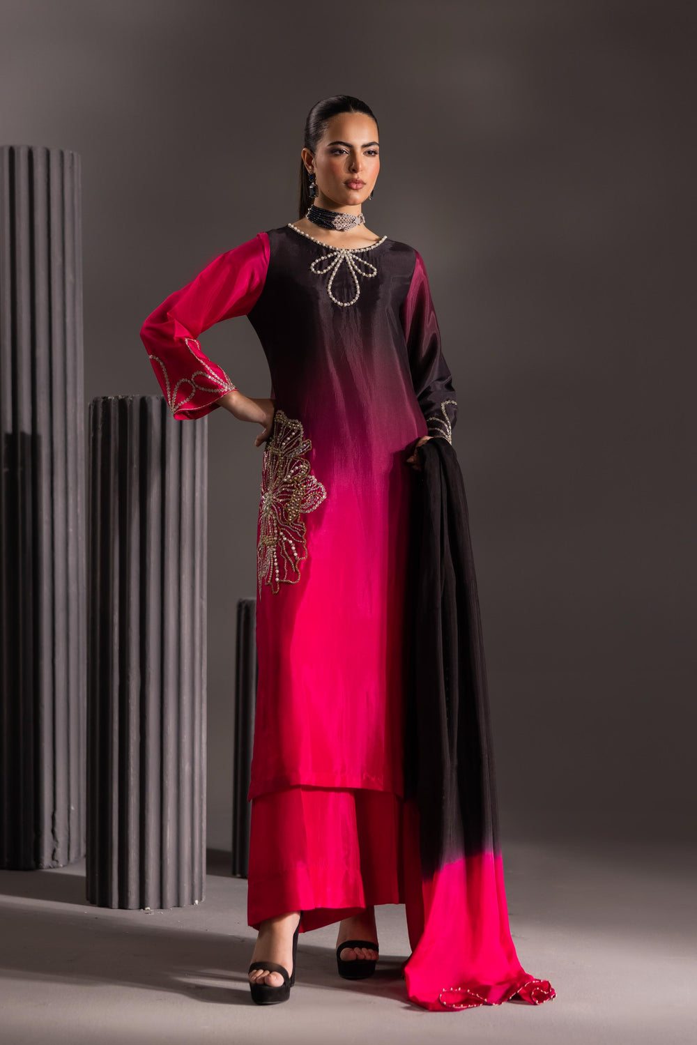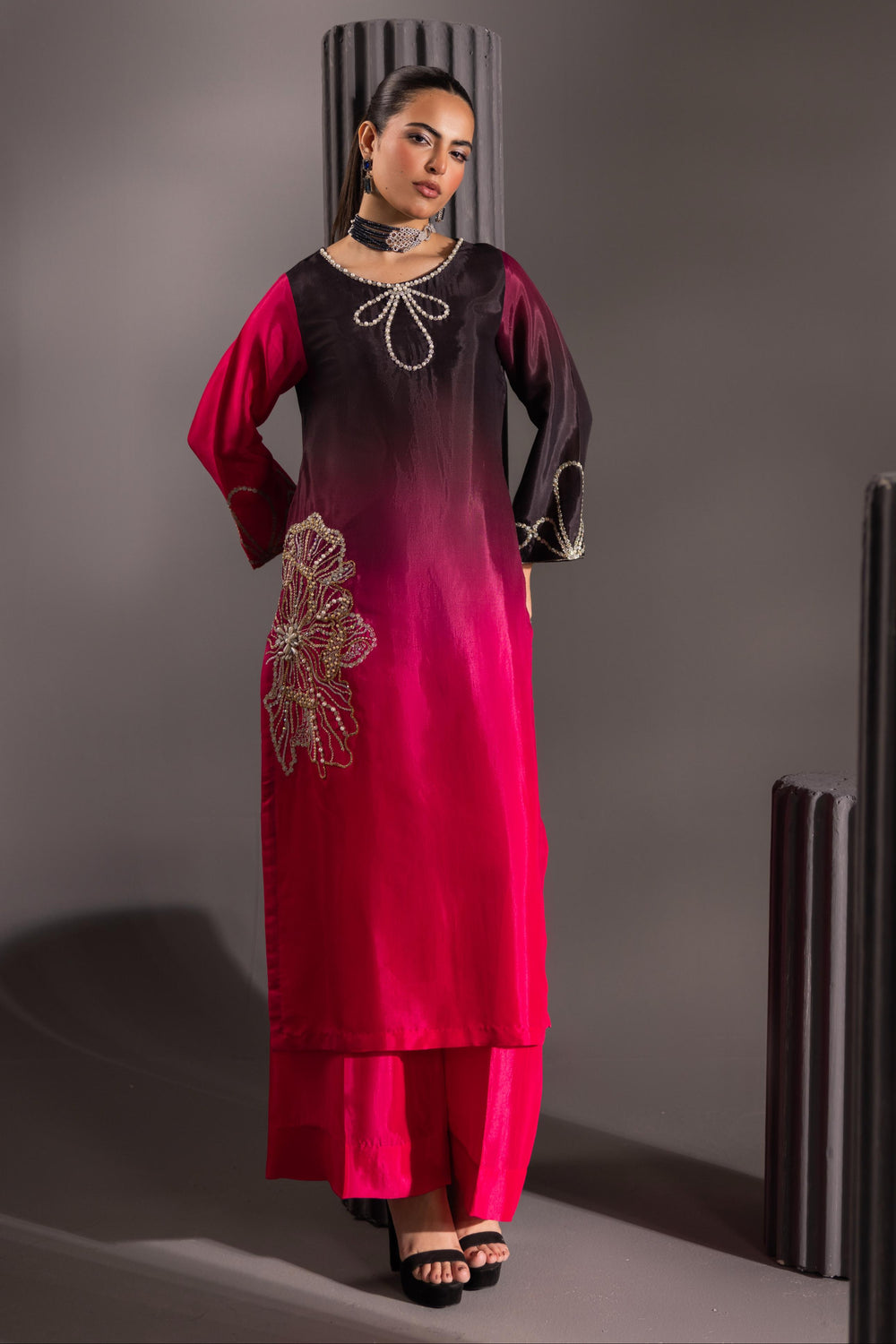 Step into the spotlight with the Ombré Radiance Ensemble, a breathtaking fusion of deep, dramatic color and exquisite artistry. This luxurious three-piece outfit features a long, straight-cut shirt crafted from rich, flowing silk that transitions seamlessly from a striking jet black at the top to a vibrant, electric fuchsia pink at the hem.