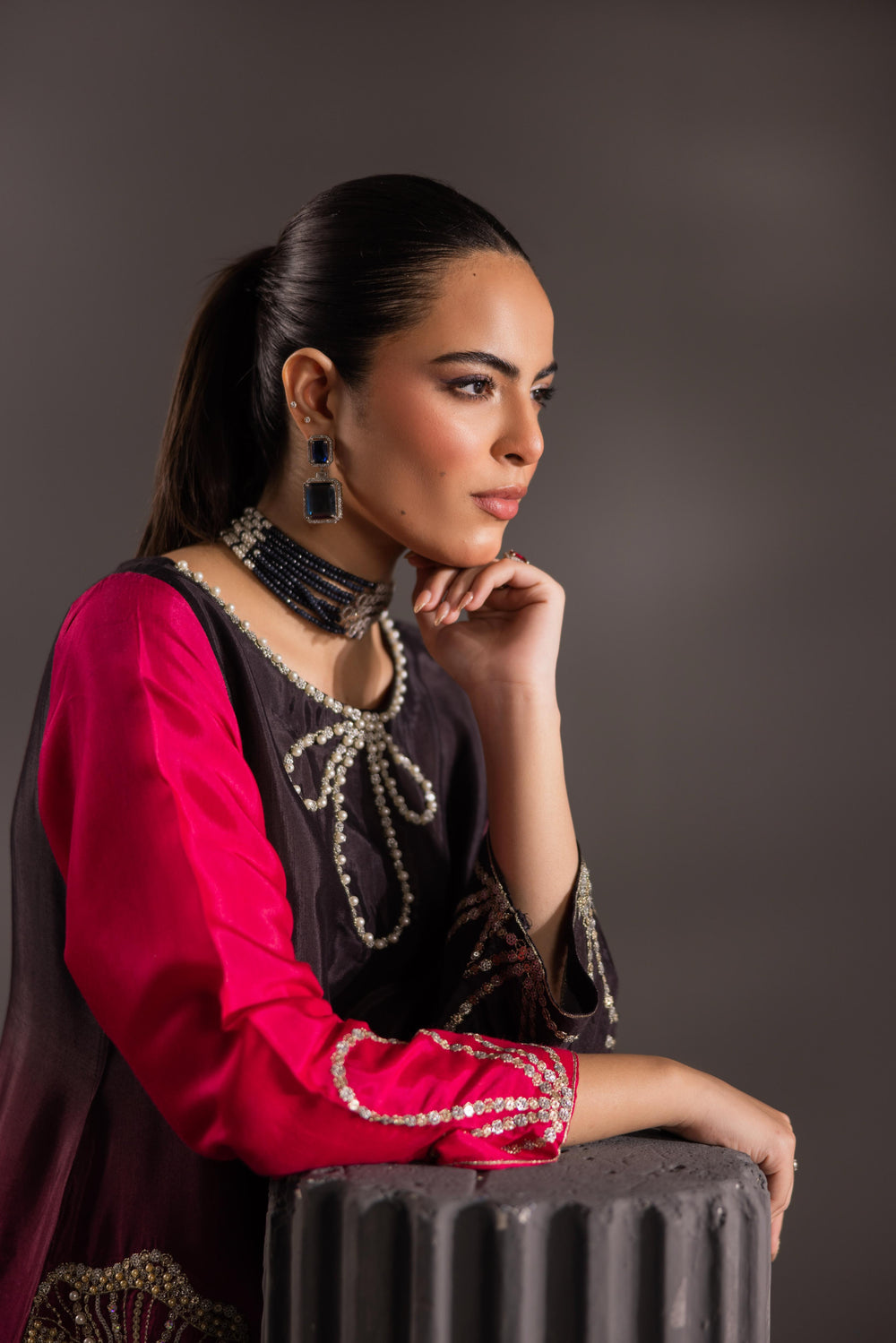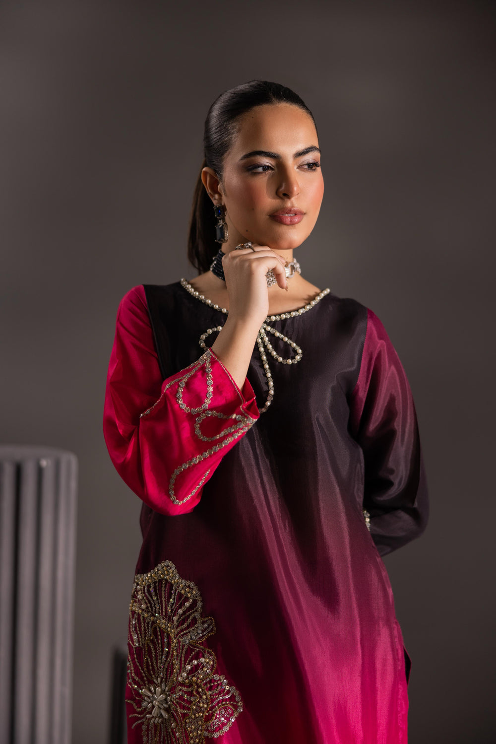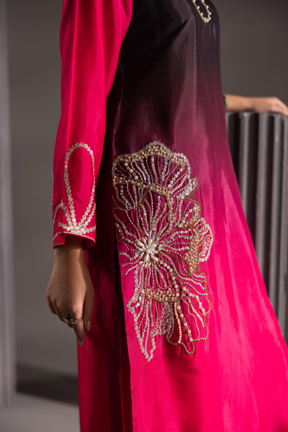 Step into the spotlight with the Ombré Radiance Ensemble, a breathtaking fusion of deep, dramatic color and exquisite artistry. This luxurious three-piece outfit features a long, straight-cut shirt crafted from rich, flowing silk that transitions seamlessly from a striking jet black at the top to a vibrant, electric fuchsia pink at the hem.
