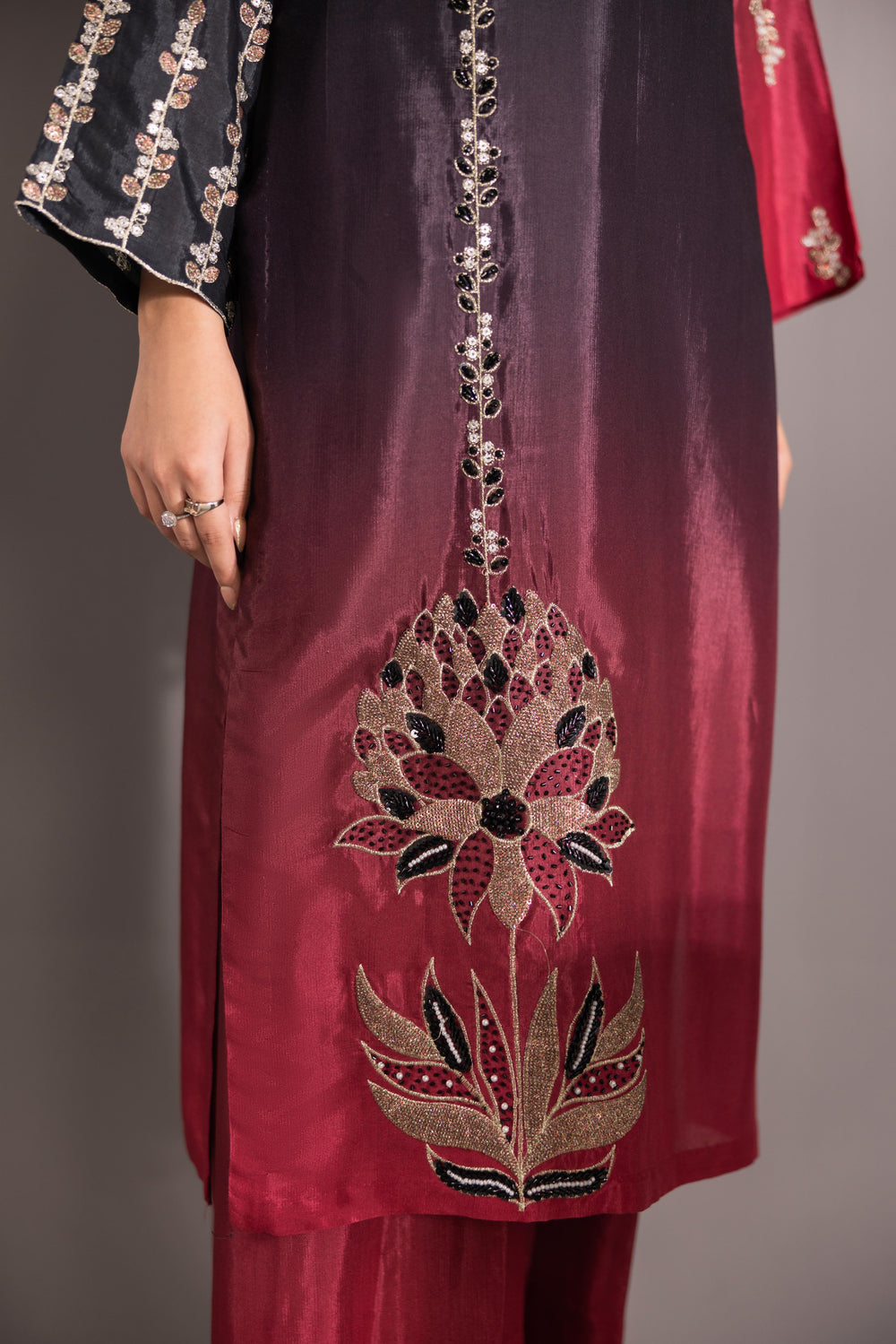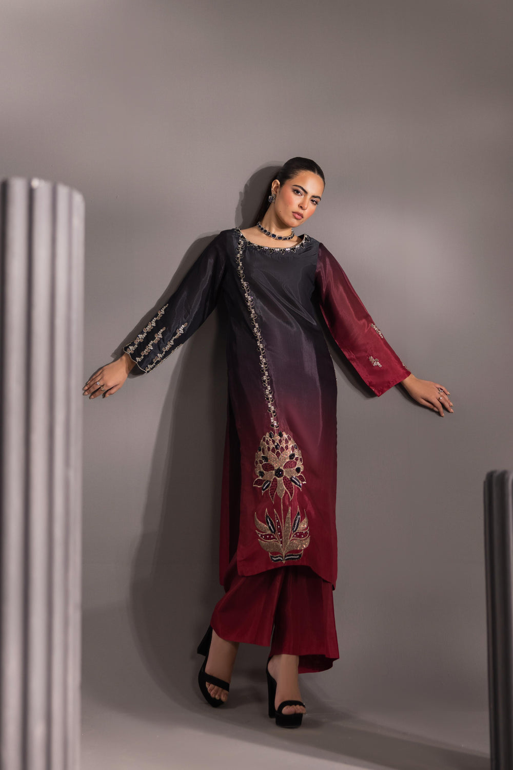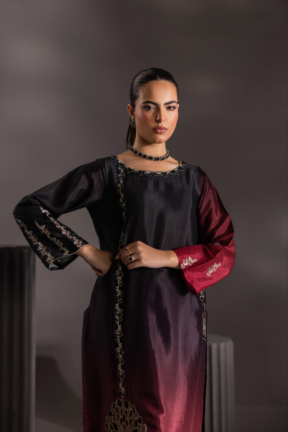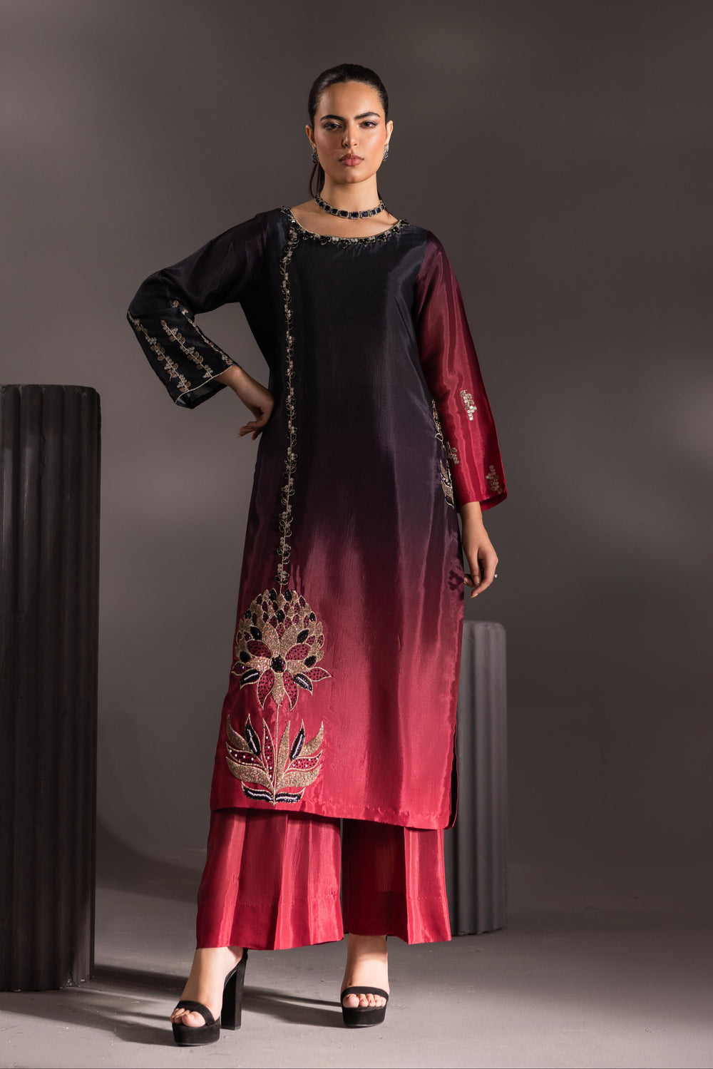 Embrace effortless sophistication with this exquisite ensemble. Crafted from rich, lustrous fabric, this silhouette features a striking ombre transition that graduates beautifully from deep, midnight black to a vibrant, passionate red. The straight silhouette is adorned with intricate shimmer red n black embroidery and hand embellishments, delicately placed to highlight the flattering line of the garment. Paired with coordinating cuellote, this set is perfect for evening events, festive gatherings, or any occasion where you want to make a truly unforgettable statement.