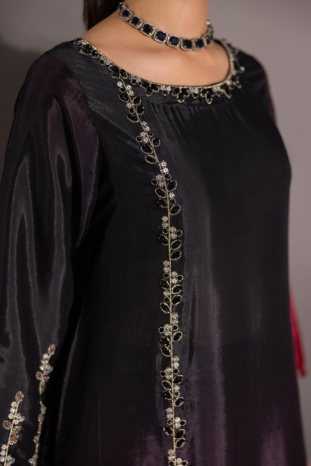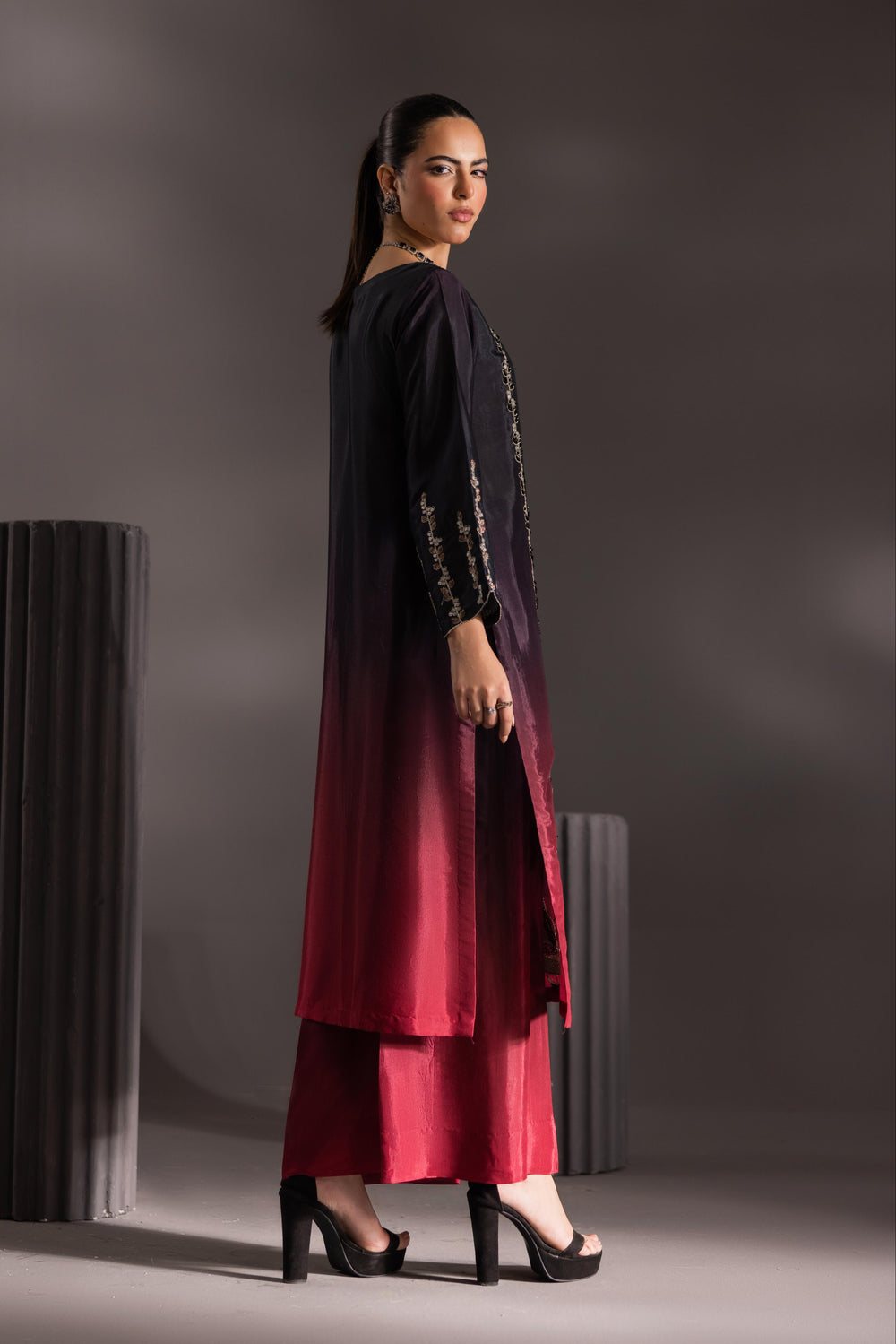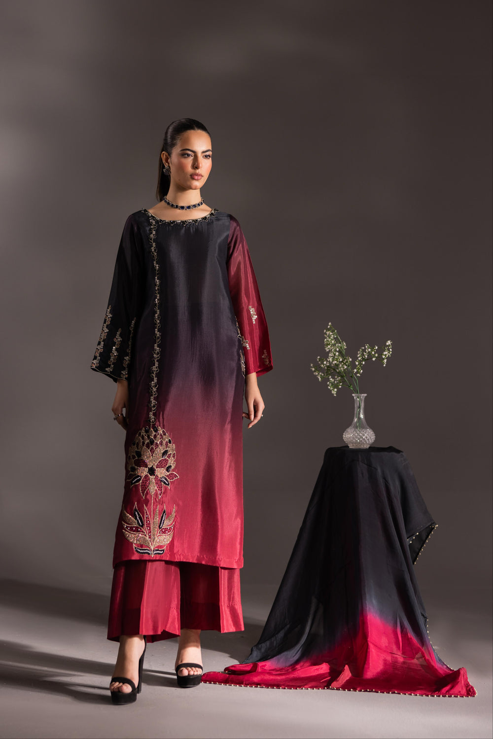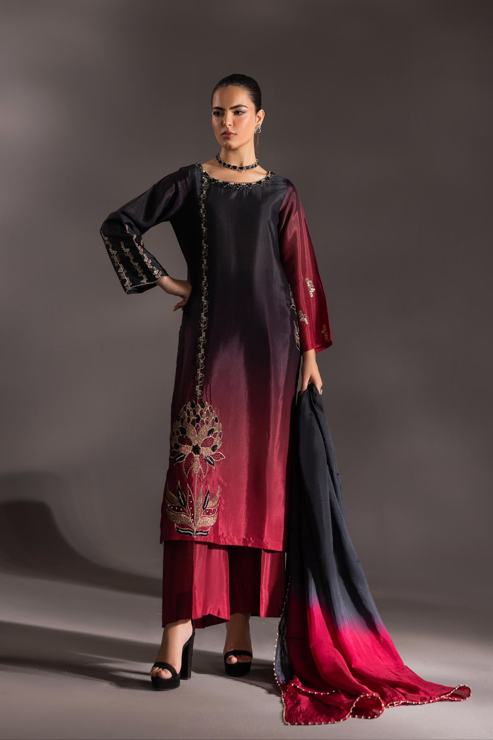 Embrace effortless sophistication with this exquisite ensemble. Crafted from rich, lustrous fabric, this silhouette features a striking ombre transition that graduates beautifully from deep, midnight black to a vibrant, passionate red. The straight silhouette is adorned with intricate shimmer red n black embroidery and hand embellishments, delicately placed to highlight the flattering line of the garment. Paired with coordinating cuellote, this set is perfect for evening events, festive gatherings, or any occasion where you want to make a truly unforgettable statement.